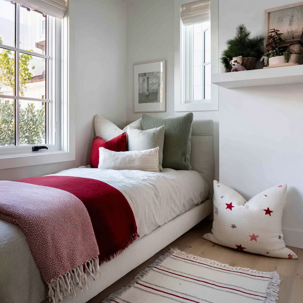 The single red pillow or throw often becomes the anchor, while surrounding textiles modulate its intensity. This method ensures the room feels festive but not crowded.