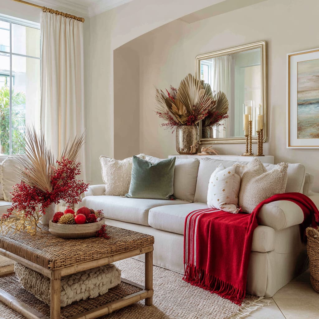 Dried palms, red berries, coastal neutrals, bright red throws.
