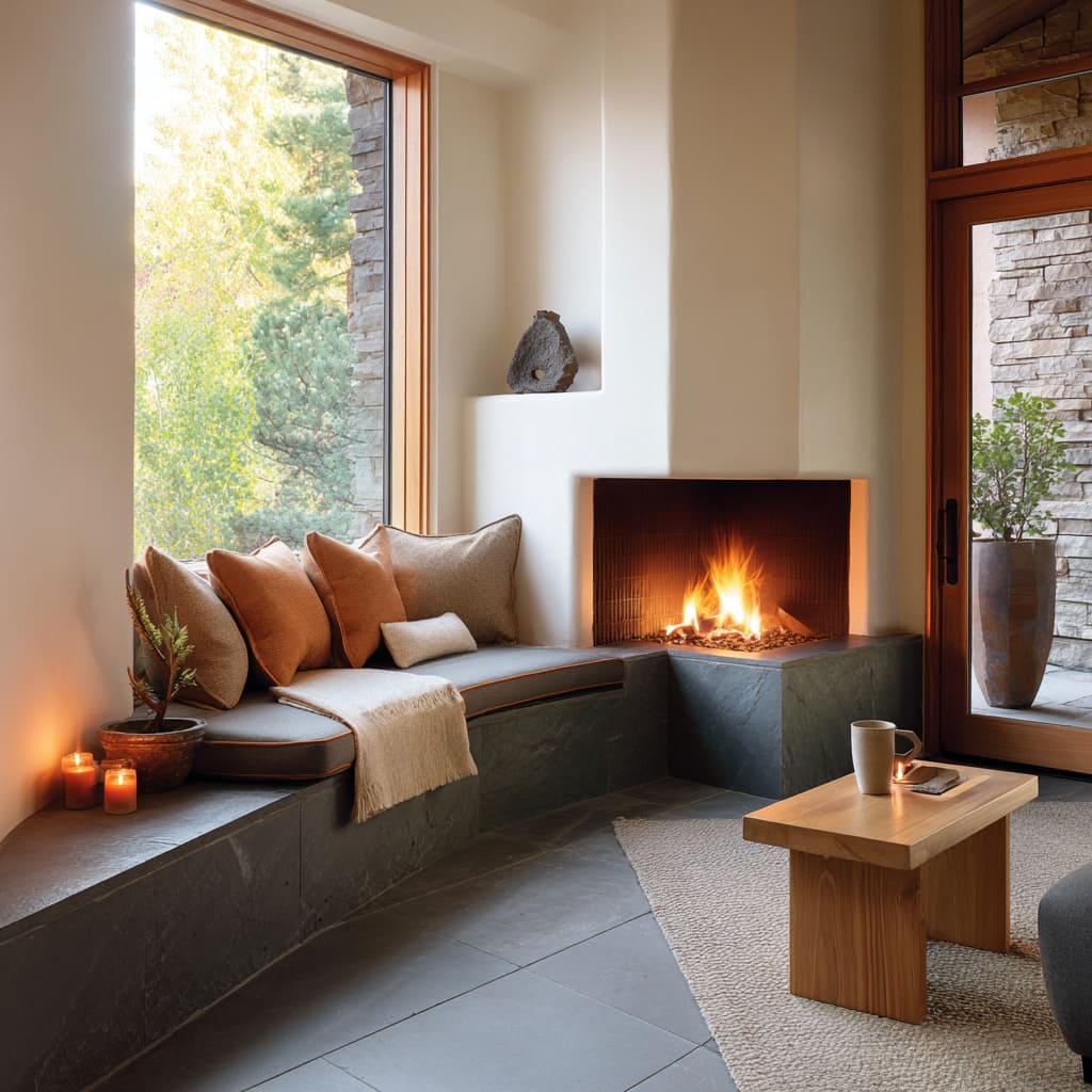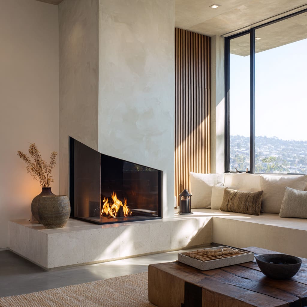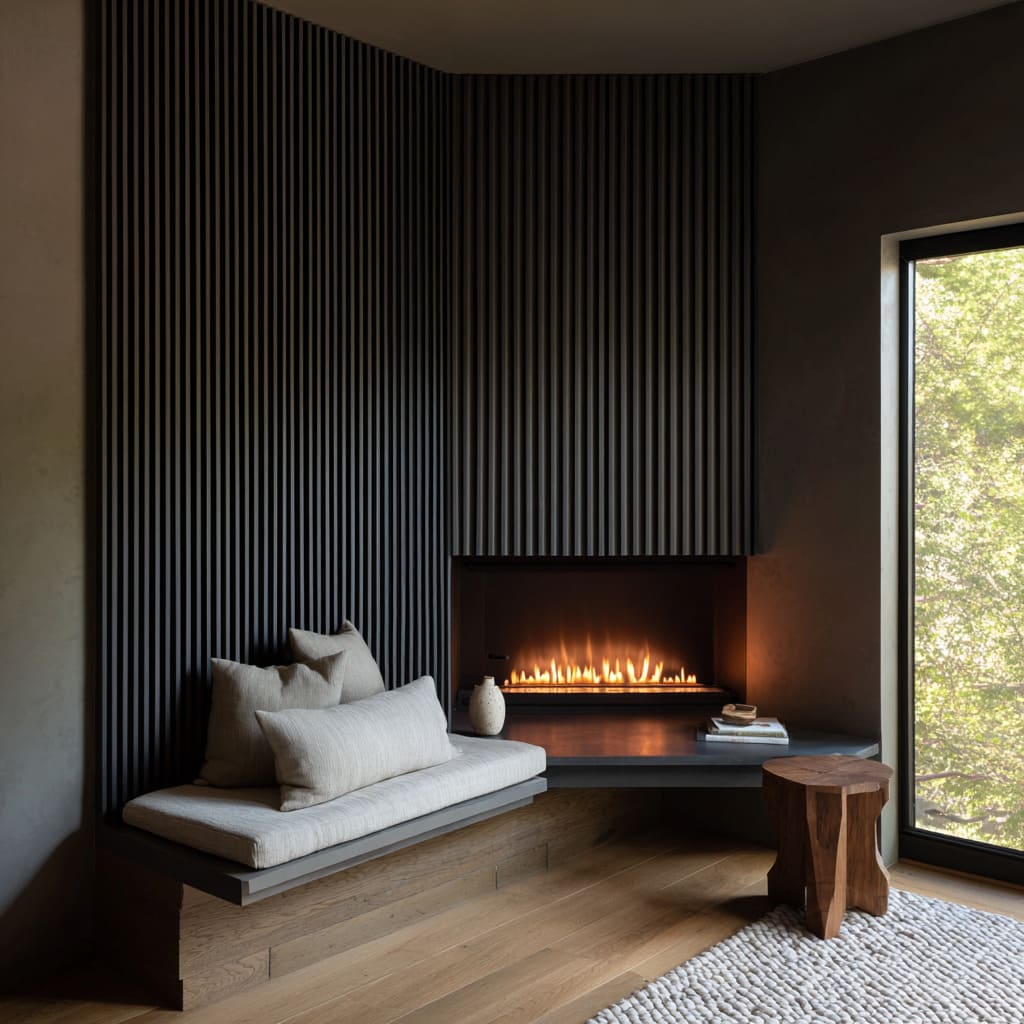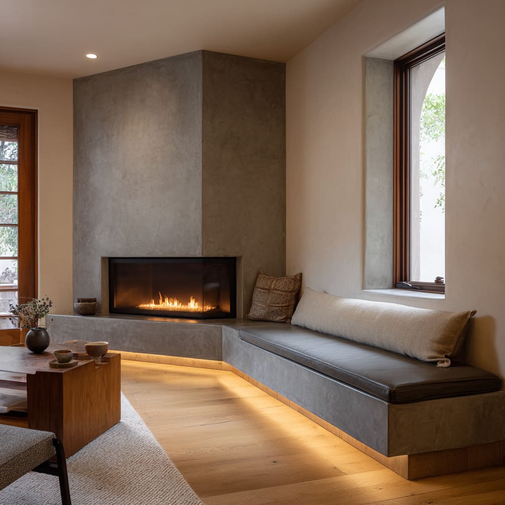 The most striking corner fireplace interior design uses the angle as a hinge between moods: the living zone on one side, the reading or lounge perch on the other. Long benches are common here—stone or concrete stretching into the window bay, trimmed with a slender cushion, forming a place to settle with a book.