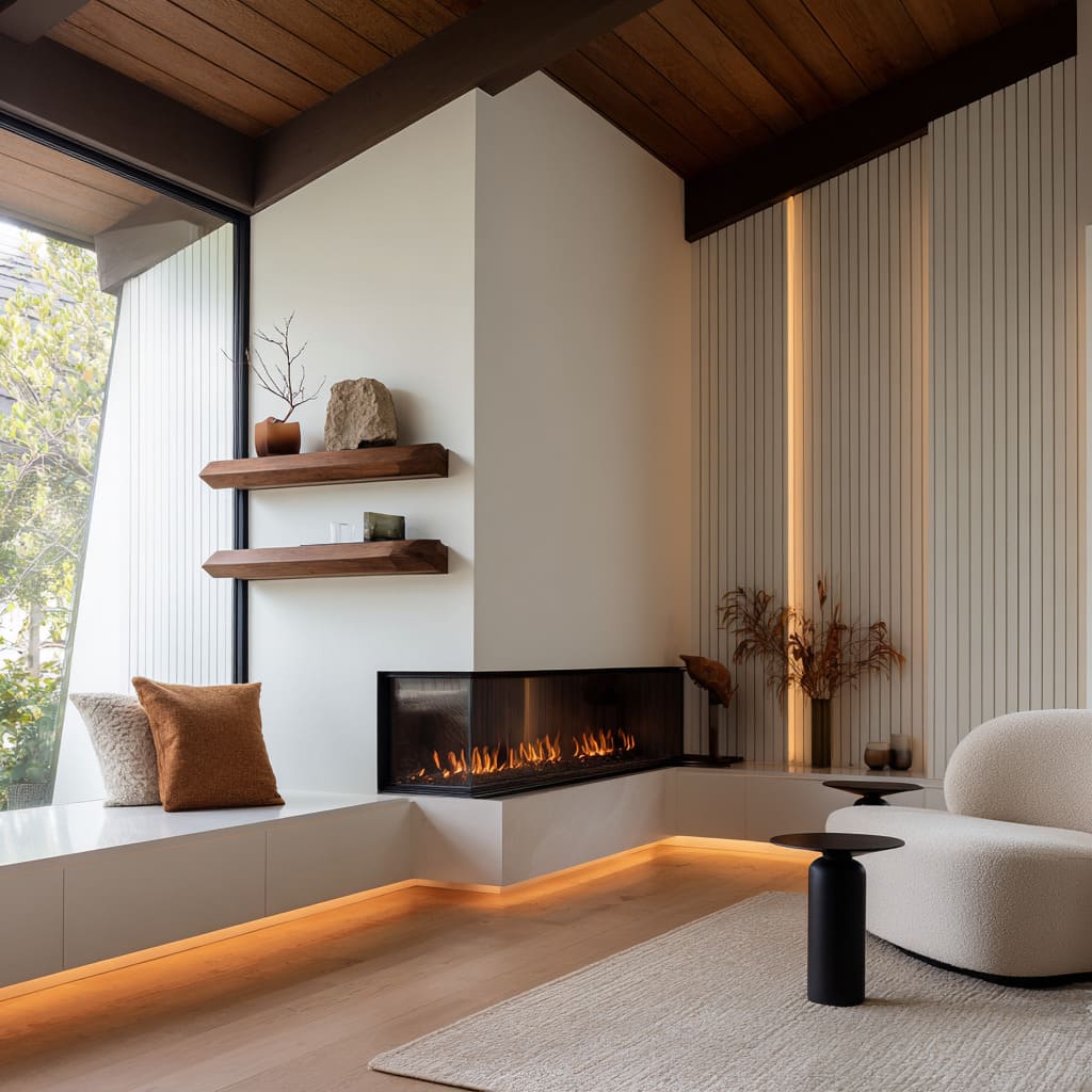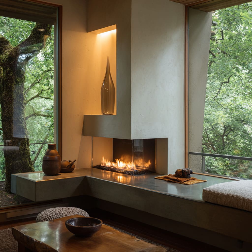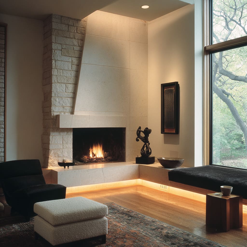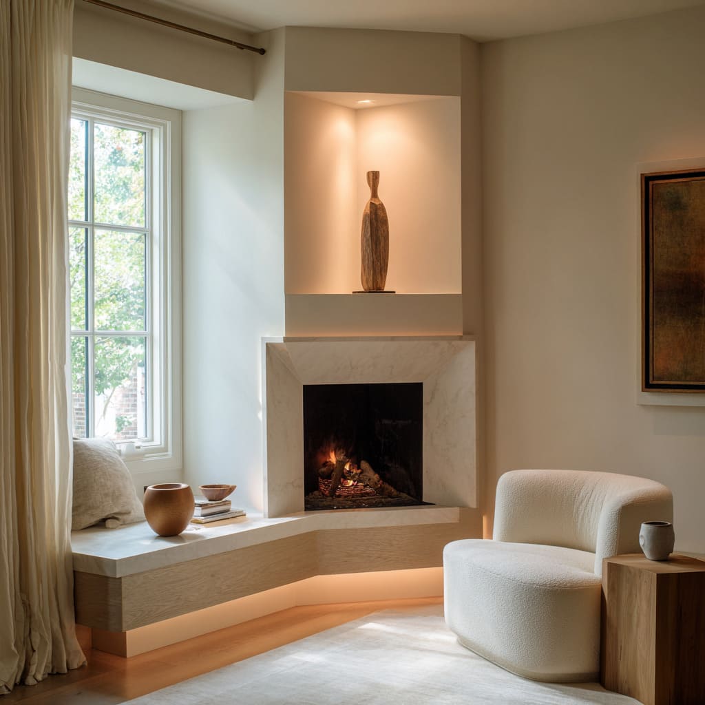 The most striking corner fireplace interior design uses the angle as a hinge between moods: the living zone on one side, the reading or lounge perch on the other. Long benches are common here—stone or concrete stretching into the window bay, trimmed with a slender cushion, forming a place to settle with a book.