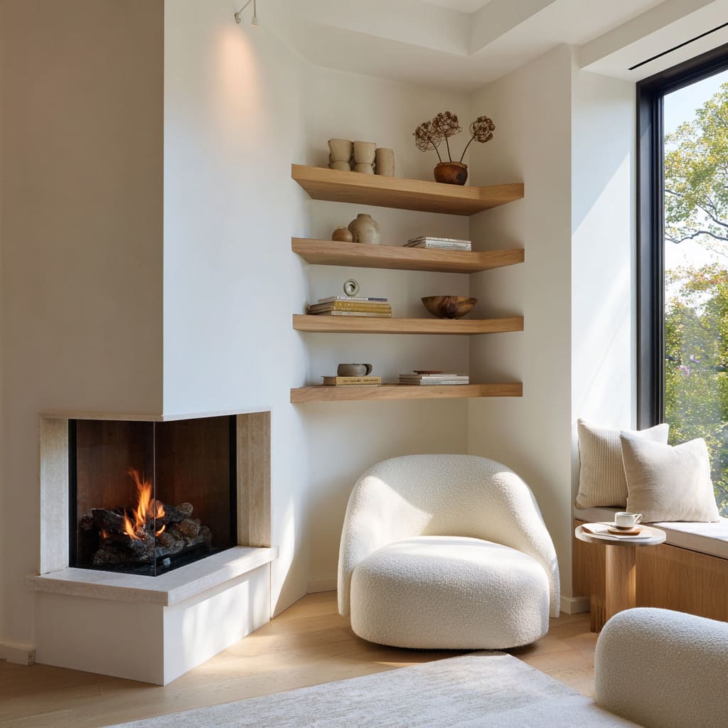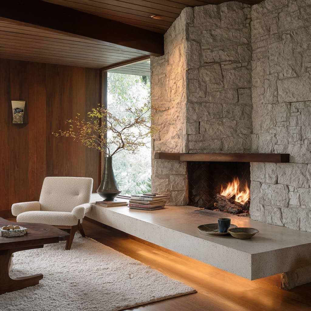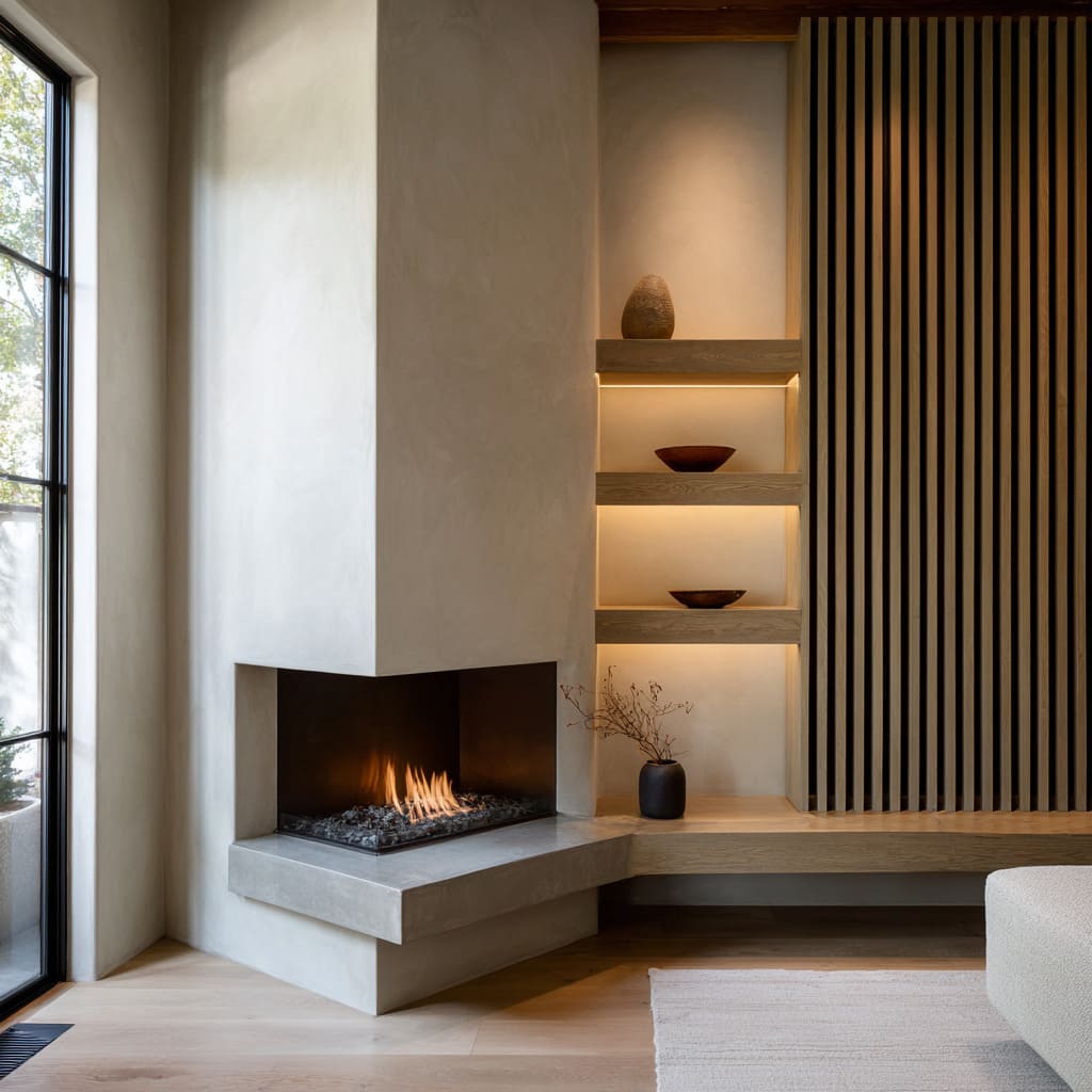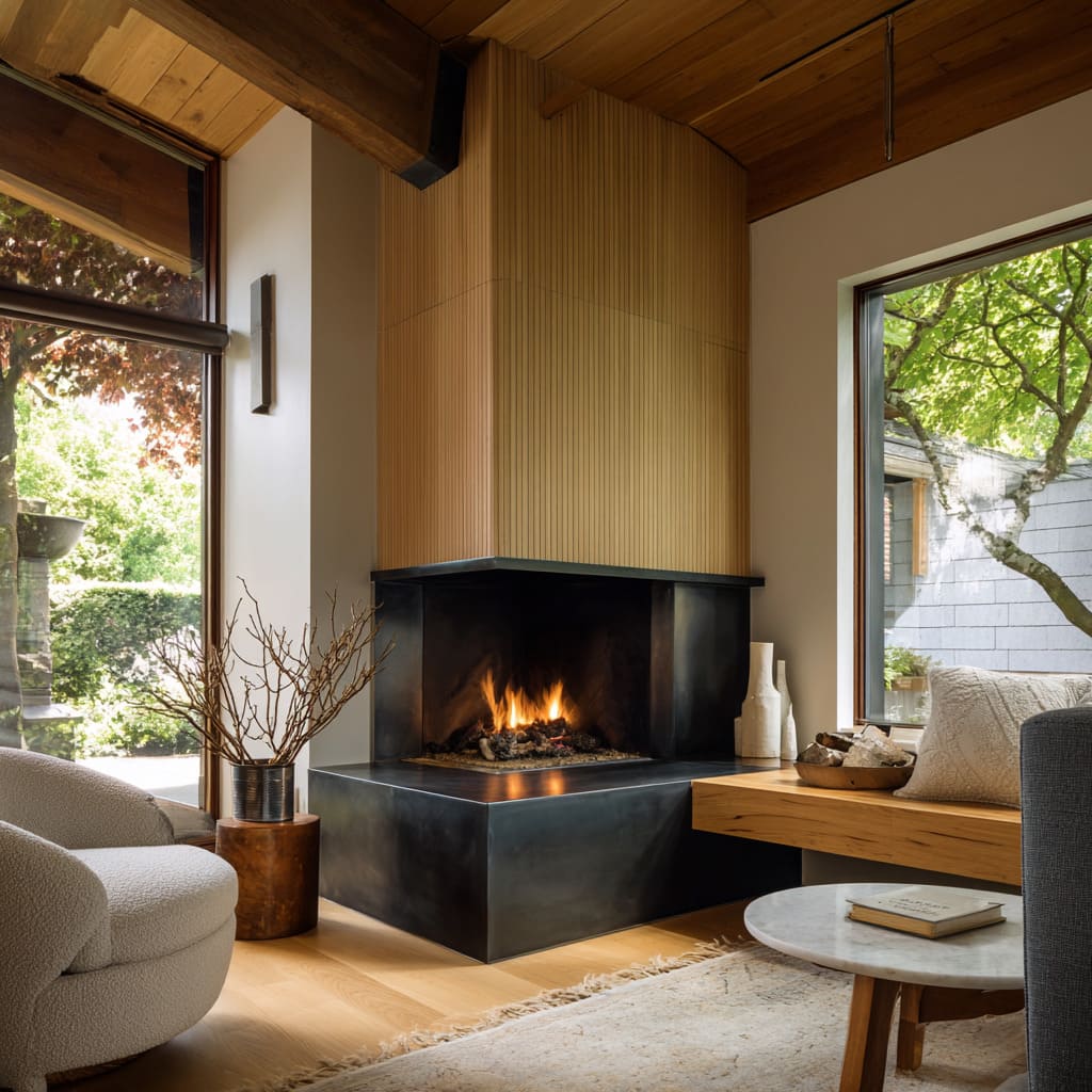 The most striking corner fireplace interior design uses the angle as a hinge between moods: the living zone on one side, the reading or lounge perch on the other. Long benches are common here—stone or concrete stretching into the window bay, trimmed with a slender cushion, forming a place to settle with a book.