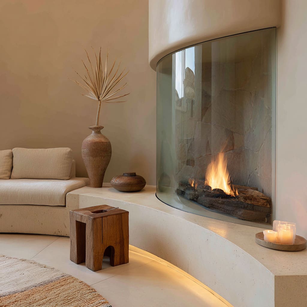 This is where corner fireplace design ideas get subtle but powerful. A clipped firebox mouth softens the turn; a radius glass curve gives a gentle sweep; a faceted plaster hood bends like folded paper.