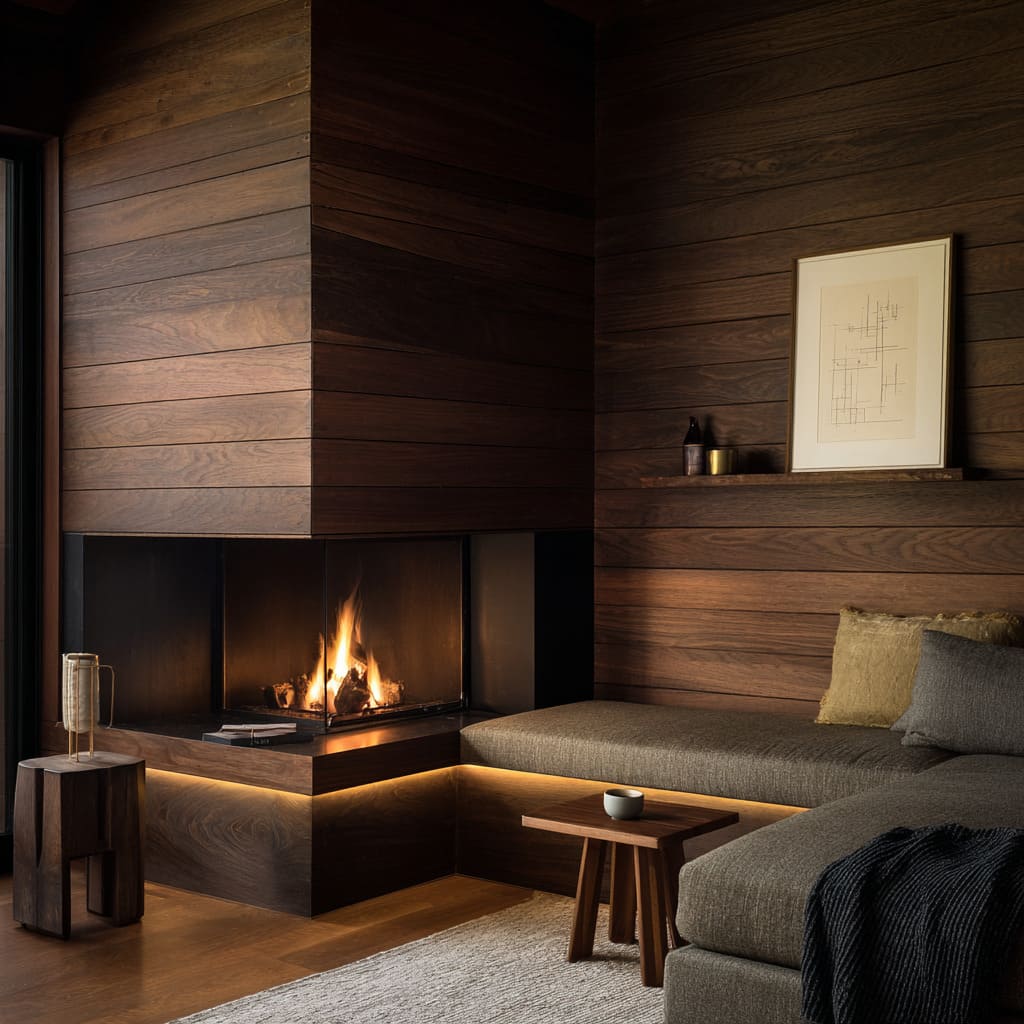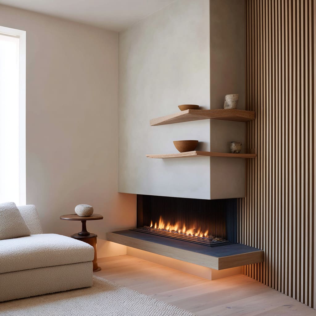 What makes many ideas for corner fireplace feel so composed is a sense of rhythm. Vertical slats on one wall, a continuous bench line below, a single sculptural shelf above, and maybe one tucked art niche.
