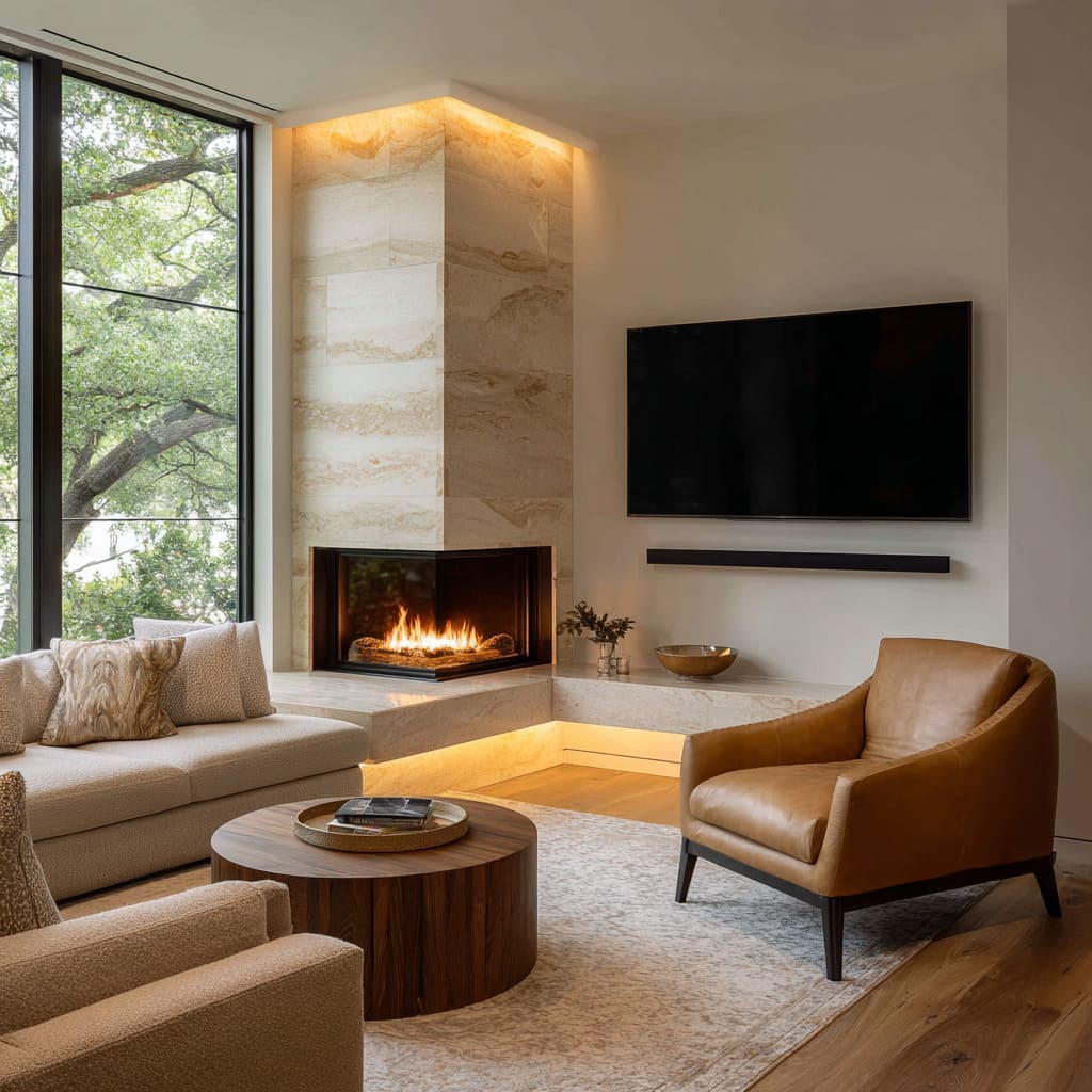 One of the most overlooked parts of corner fireplace design ideas is the way light becomes part of the composition, not just a tool to see the room. The most thoughtful examples use a light pattern, not a beam.