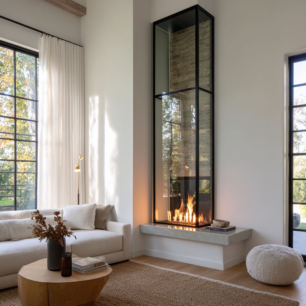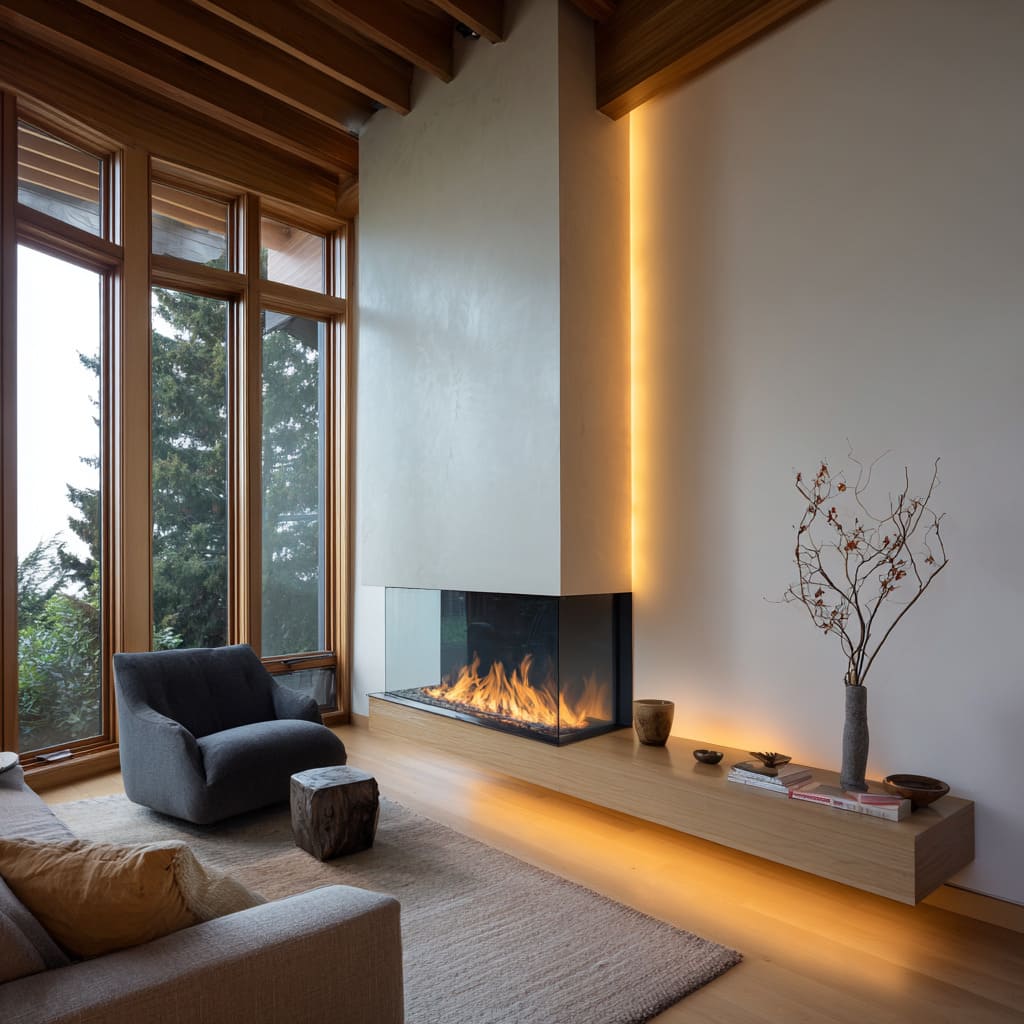 In many modern rooms, corner fireplace design ideas treat the angle as a flow point rather than a leftover nook. Long ledges run into the corner and continue with no break; stone or plaster planes turn gently; glass rounds the angle with fire flickering along both sides.