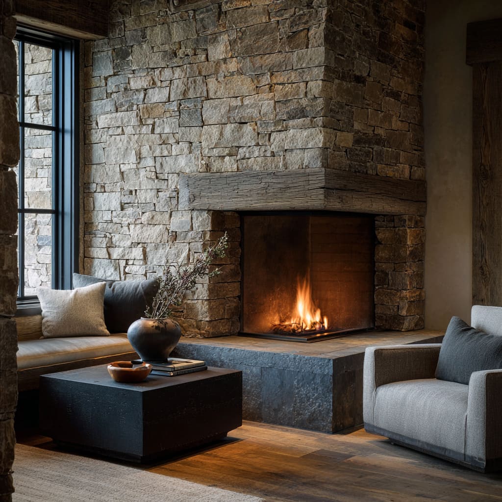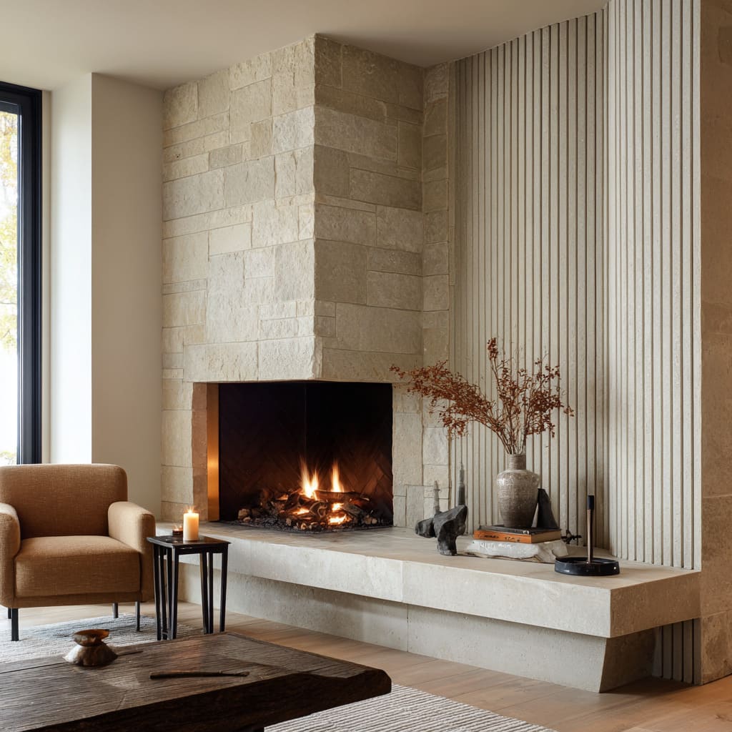 Corner fireplaces often lean on warm natural finishes that show subtle character under soft light. Smooth limestone and rough split-face stone appear again and again, sometimes paired with thick oak benches or slim wood mantels.