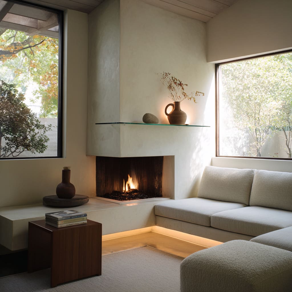 What stands out across the best corner fireplace interior design examples is restraint paired with depth. The fireplace corner may include fire, a bench, a lamp, a tiny cluster of pottery, and a mirror band—yet it never feels full.