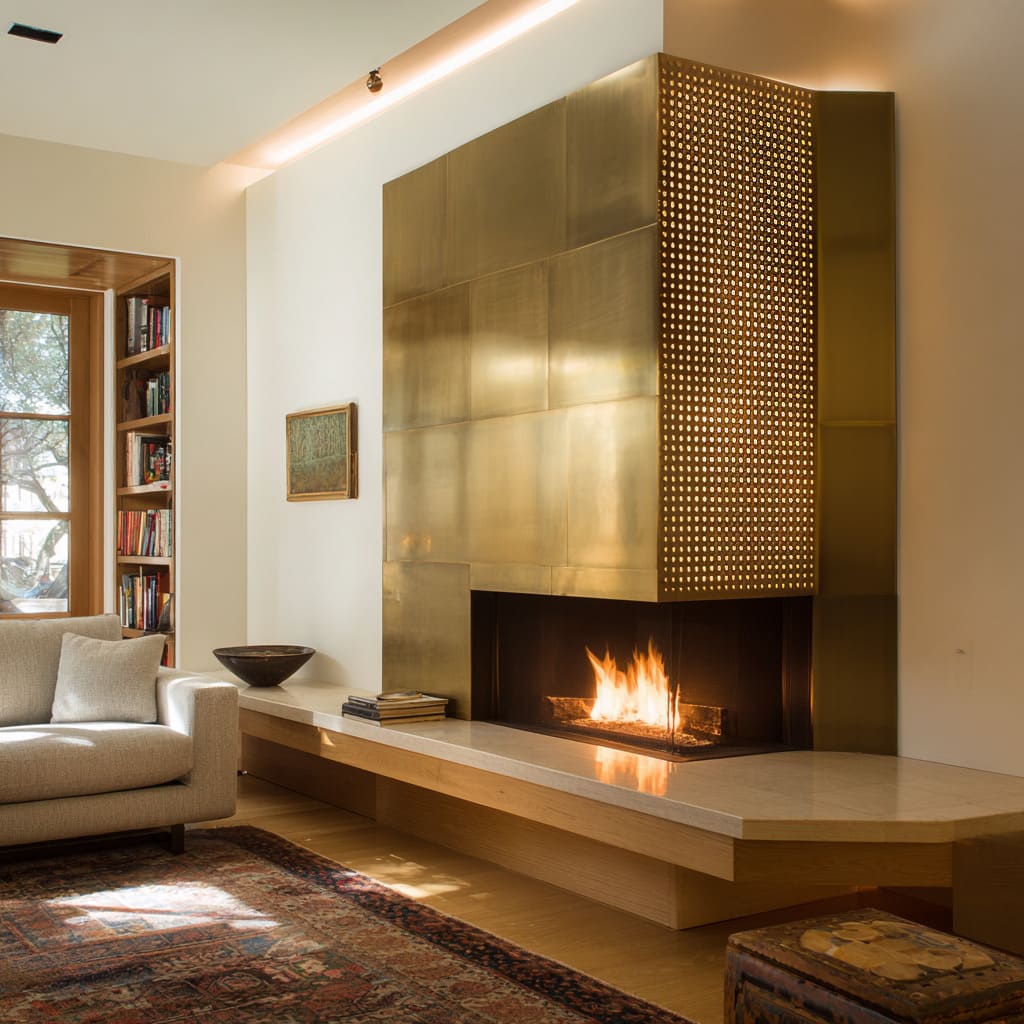 The room design reads unified because the fireplace does not end at an edge—it sweeps through it.