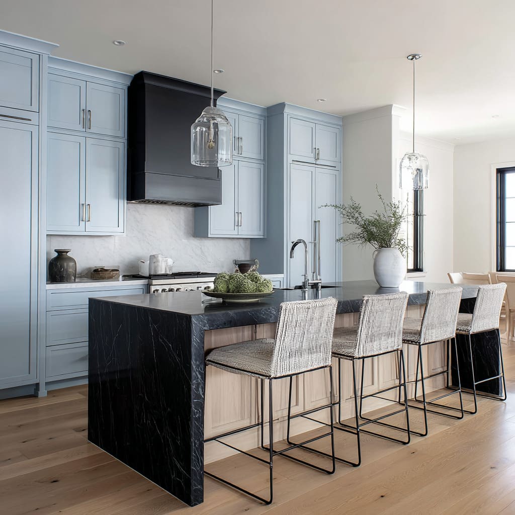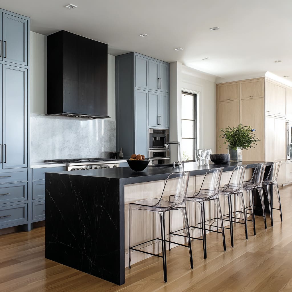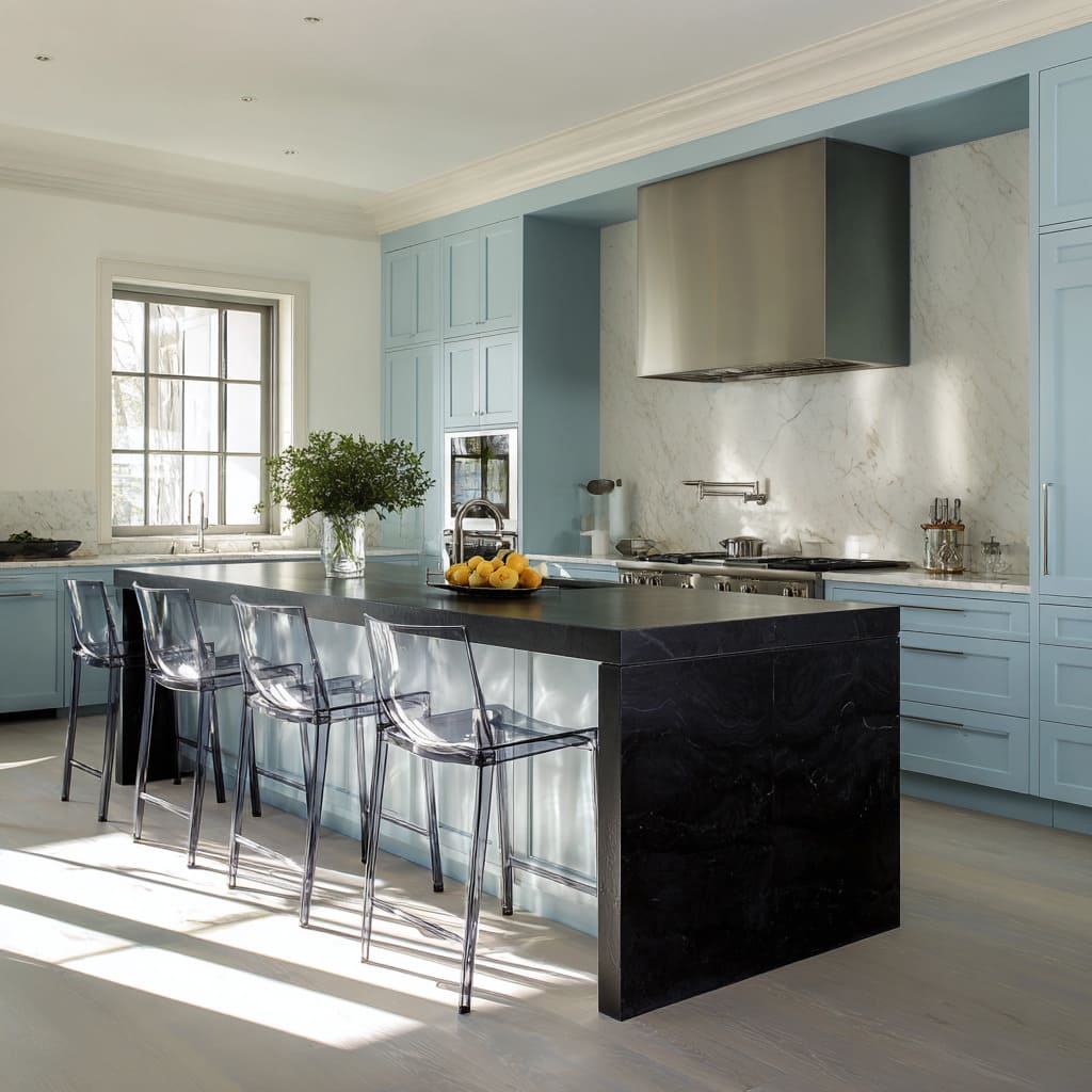 Pale blue kitchen design with graphite island and clear acrylic stools letting light stripe the dark island face with airy silhouettes