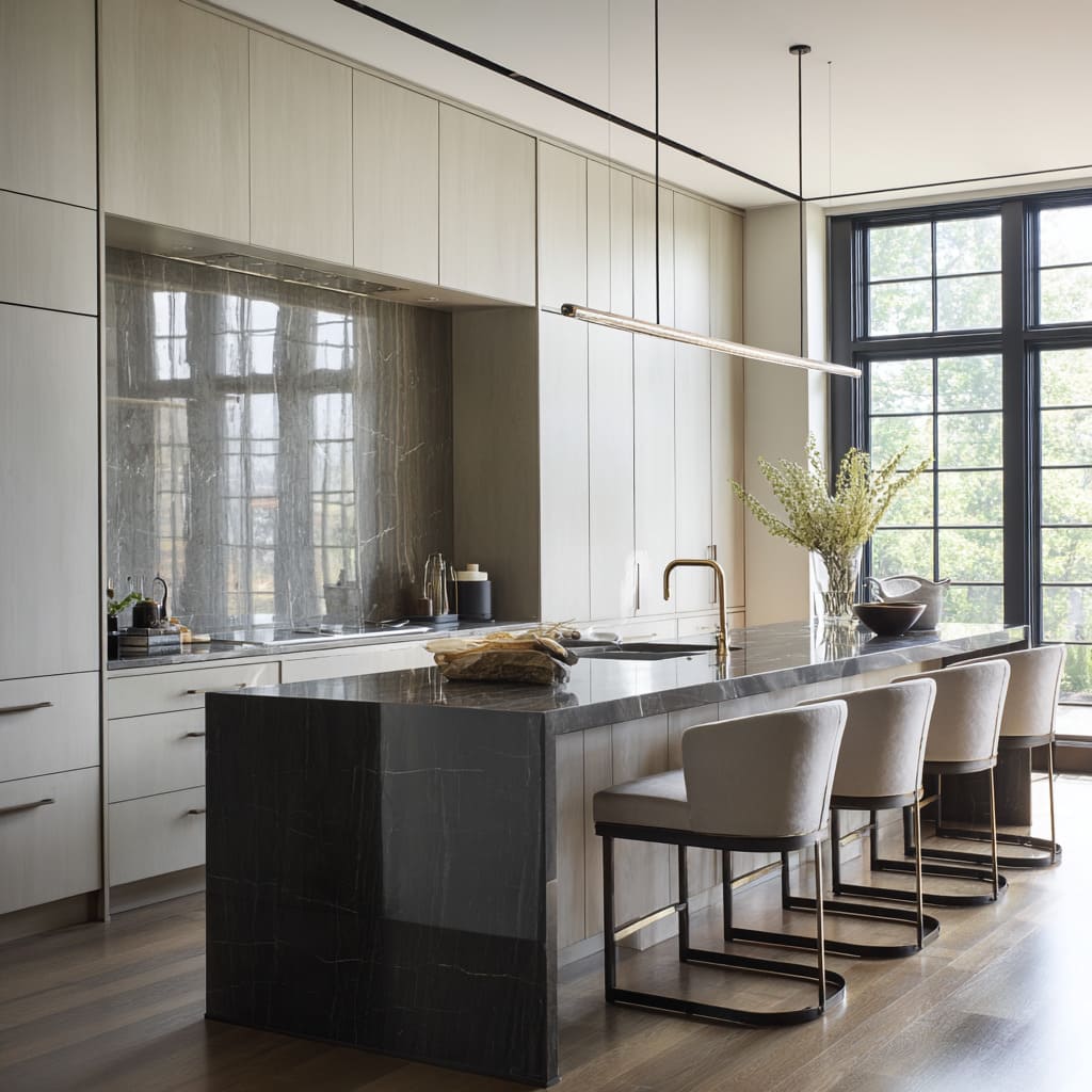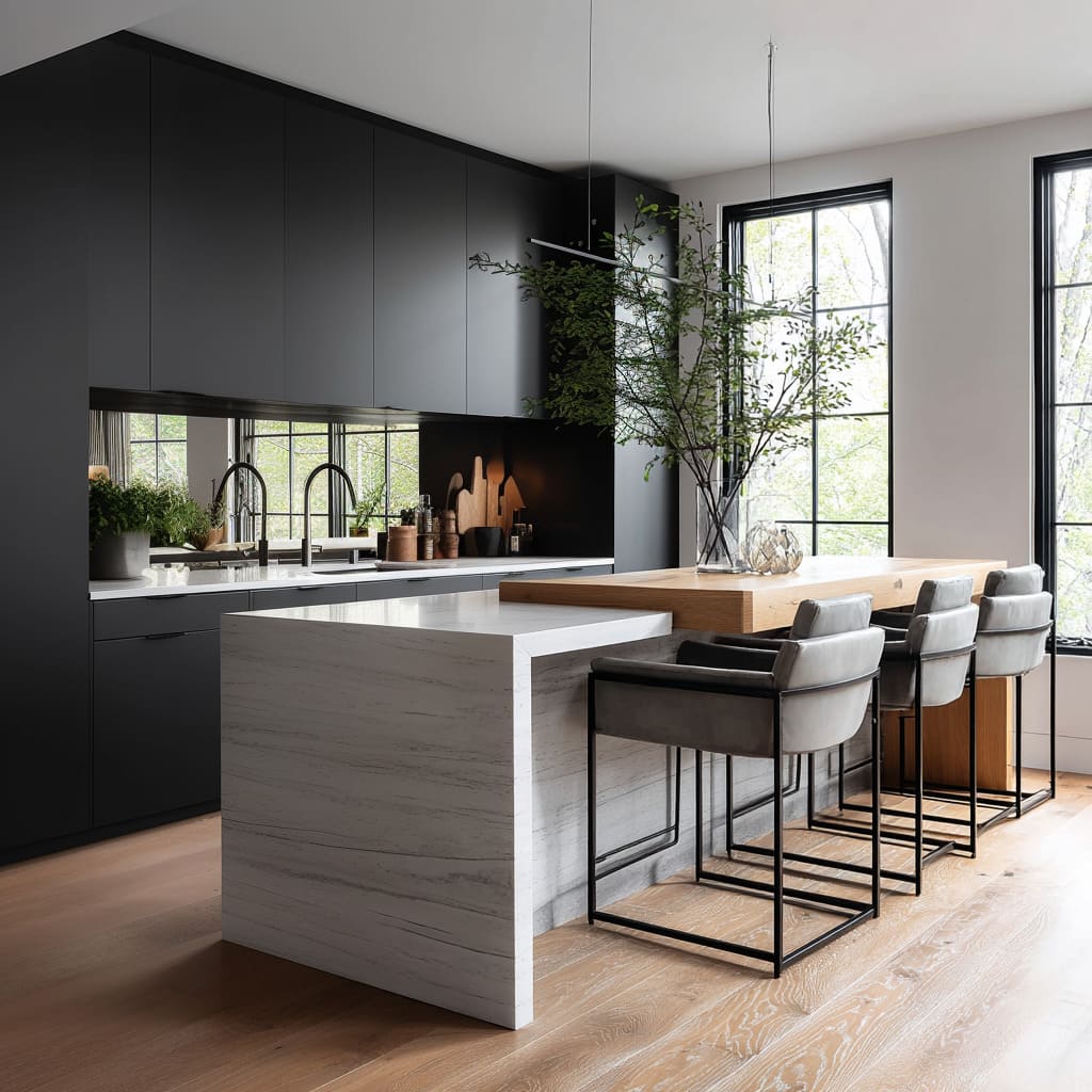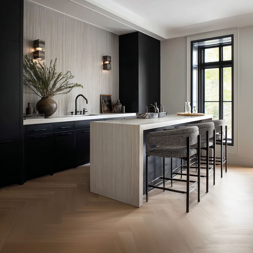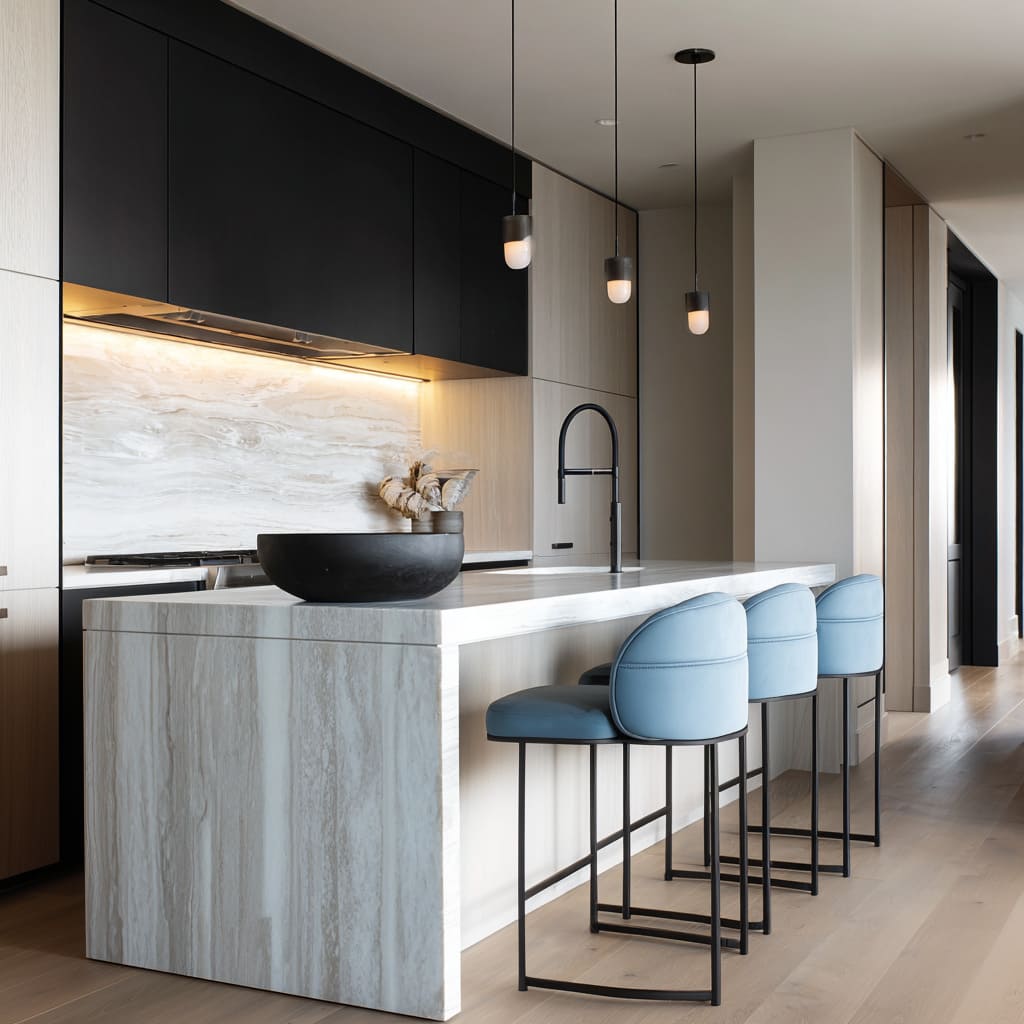 The geometry of stools often mirrors or counterbalances the island’s personality. A squared mitered waterfall slab asks for rectilinear stools—sharp seats, straight backs, and clean fronts.