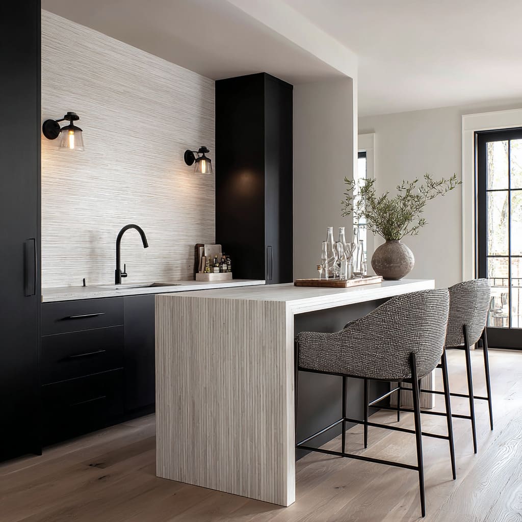 Charcoal island concept with sand-colored upholstered stools on bronze cantilever bases paired with pale oak cabinetry and fluted backsplash