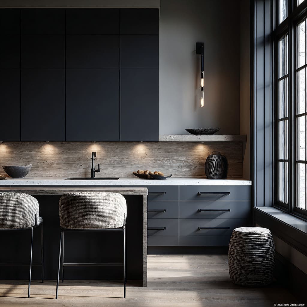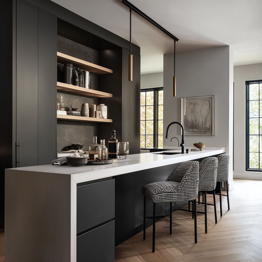 Geometry, tone, sheen, and alignment all converge at the seating line—the meeting point of human scale and built structure. In this harmony, stools are not accessories but punctuation: small, precise marks that define rhythm, continuity, and visual comfort in every contemporary kitchen composition.