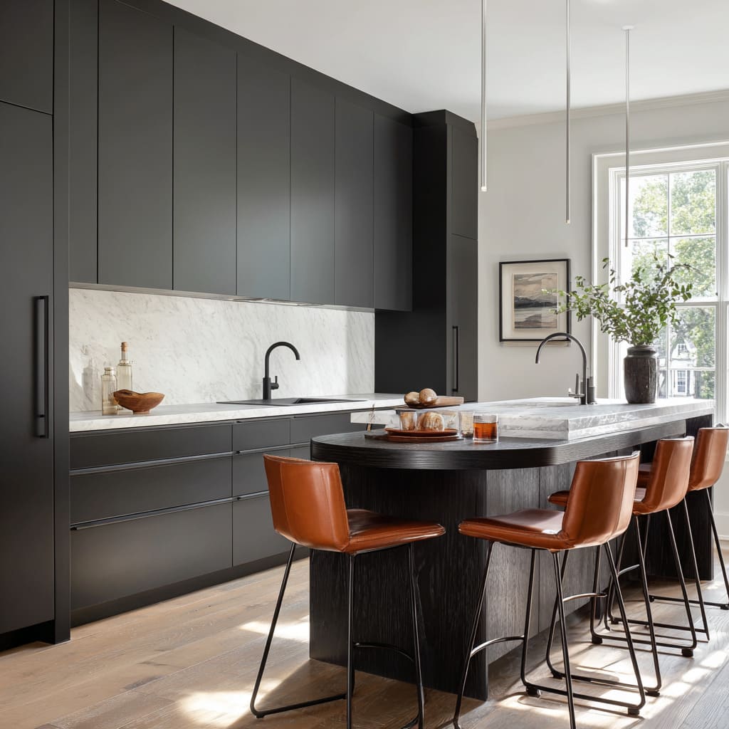 Leather upholstery bridges warmth and coolness: tan or caramel shades ease the contrast between dark cabinetry and pale counters, while gray tones soften black islands without flattening them. Matte finishes eliminate glare from pendant lighting and polished surfaces.