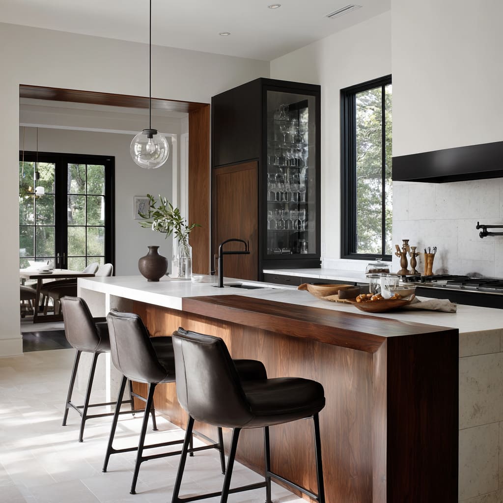 Modern kitchen design with walnut bar cap and white stone island featuring three black-framed brown leather stools under a stepped countertop