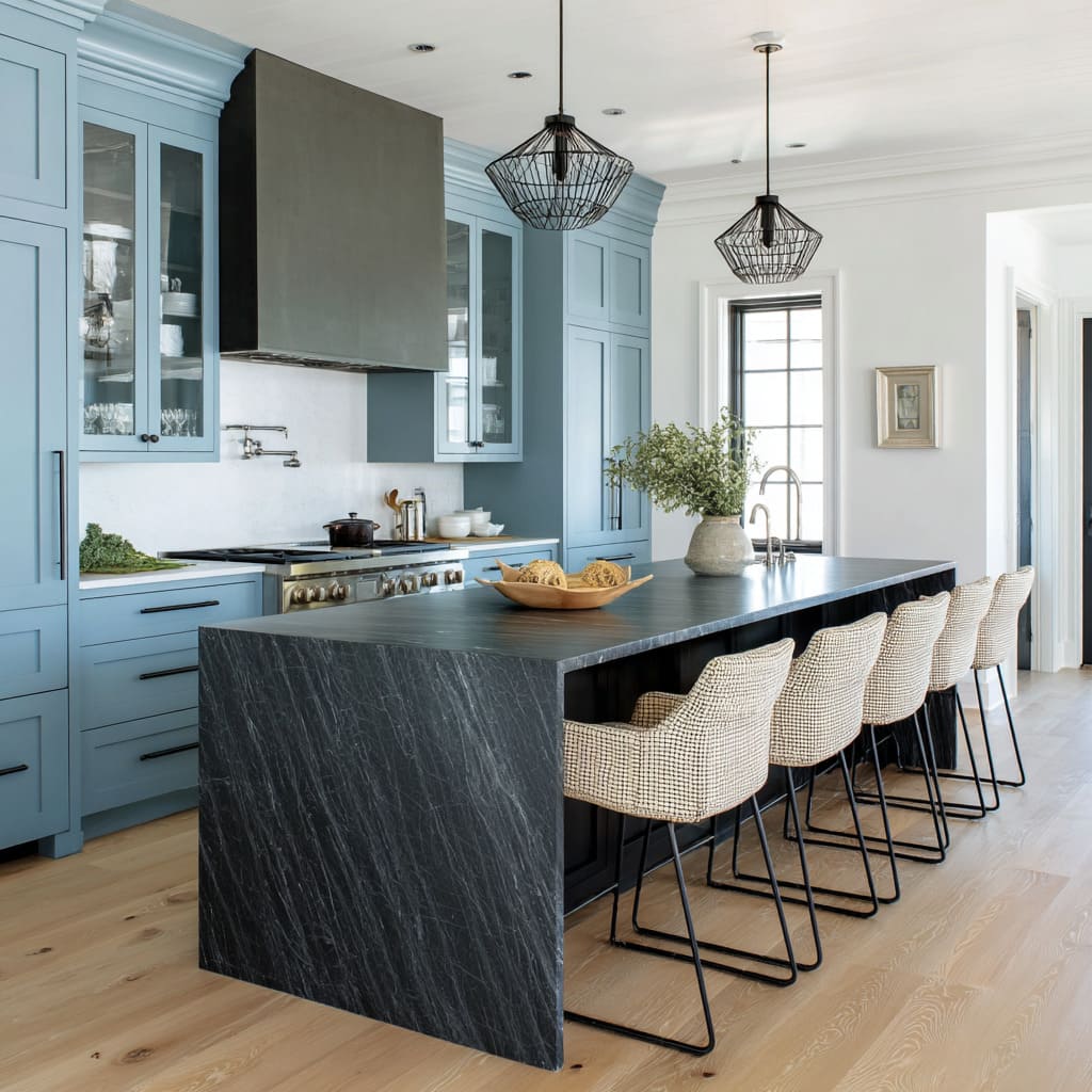 Soft blue kitchen ideas with feathery marble island and sand-colored cord stools on black steel frames echoing stone bevels