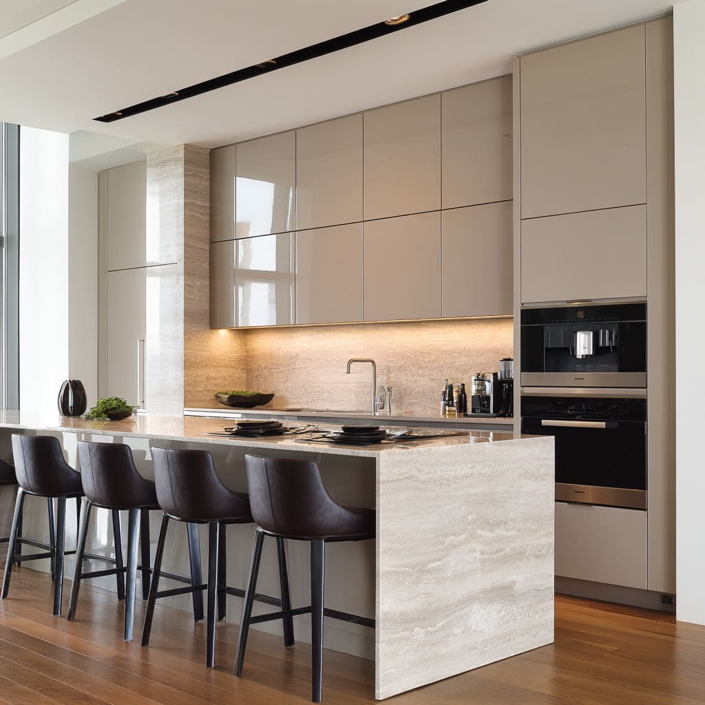 Travertine kitchen island ideas with taupe lacquer panels and deep-brown leather stools on straight black legs against soft lighting
