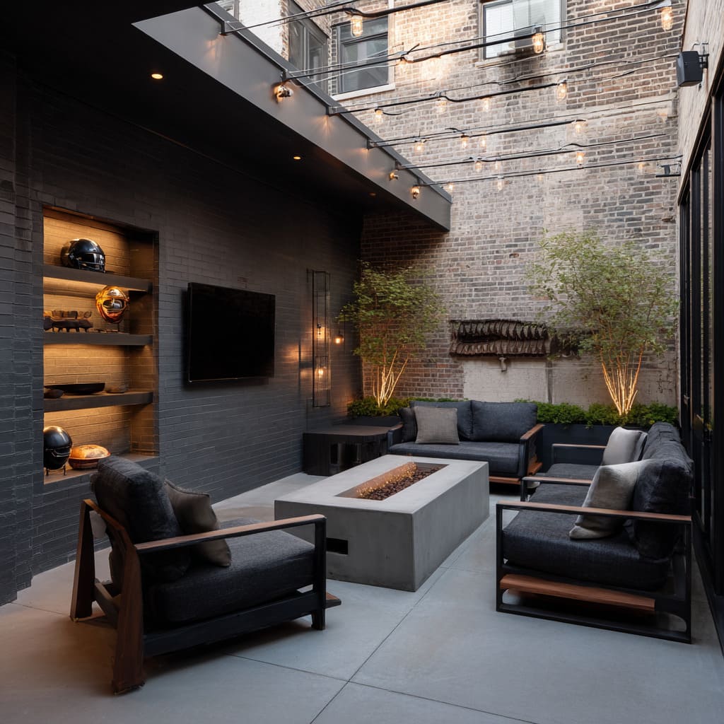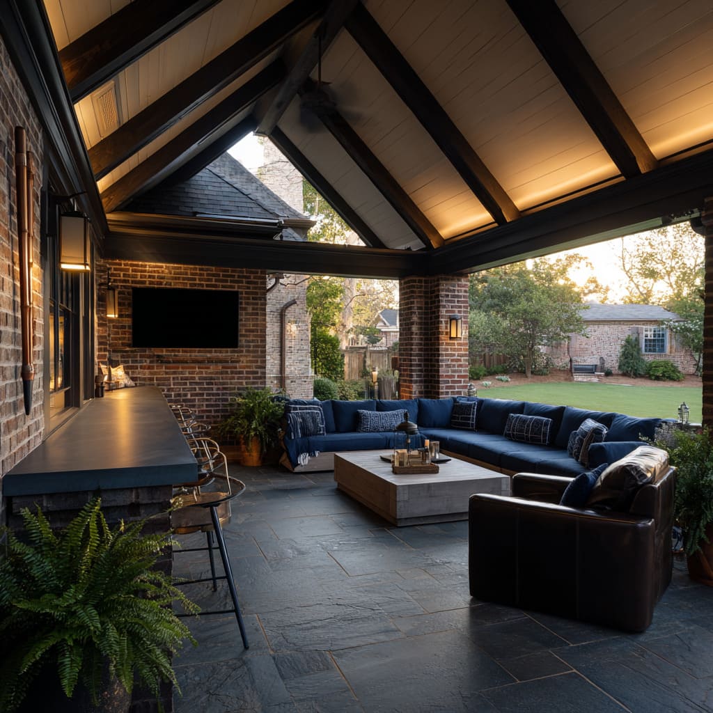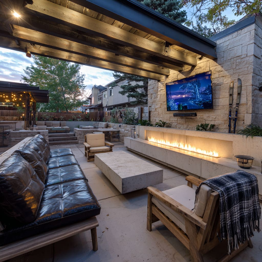 What makes outdoor man cave ideas look modern is color restraint. The dominant shades tend to be charcoal, sand, ash, and muted timber tones, with one rich accent repeated for continuity—caramel leather, navy upholstery, or rusted metal.