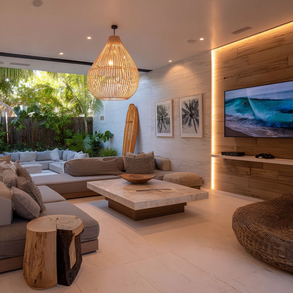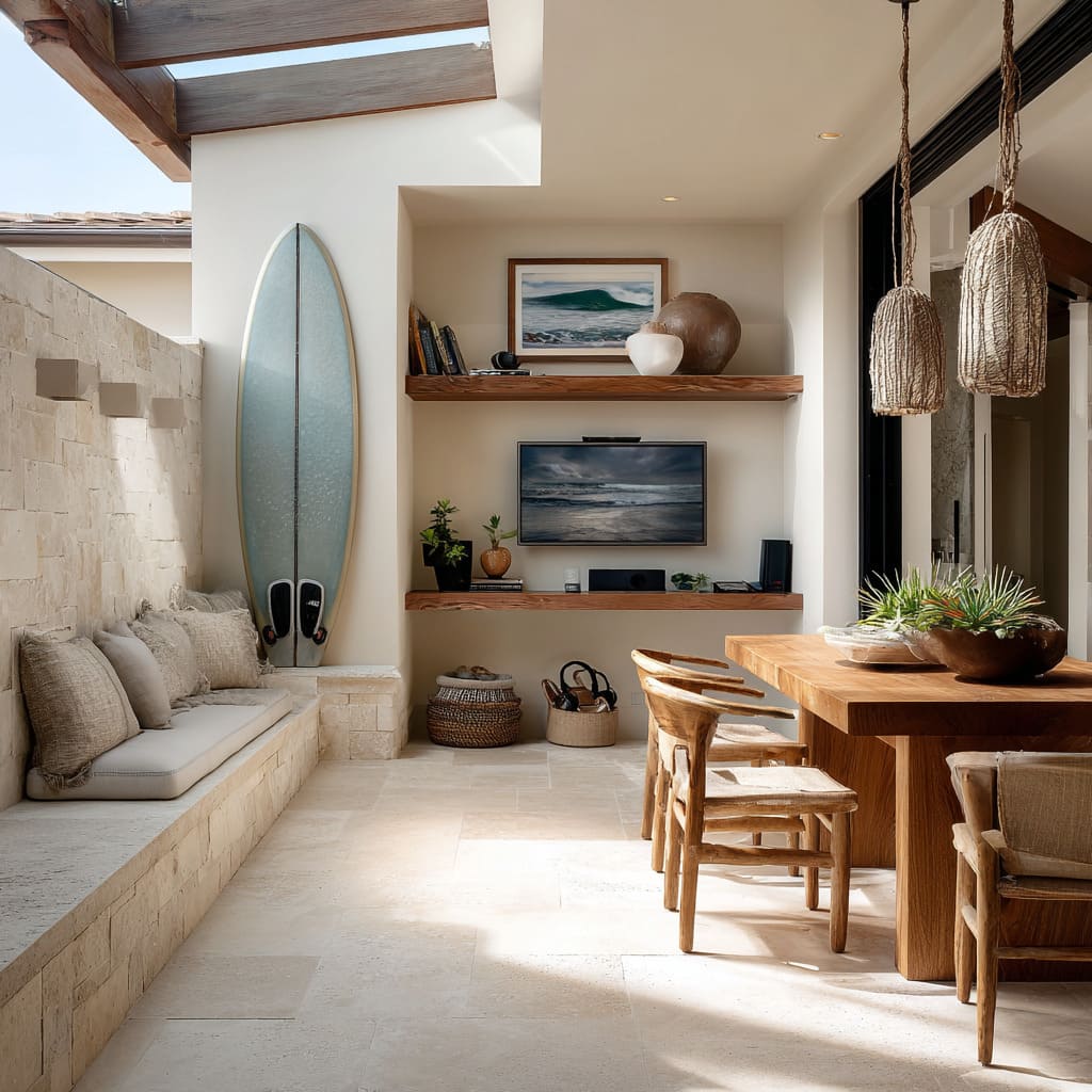 Texture, not hue, does most of the expressive work: nubby cushions against smooth concrete, ribbed rugs beside planed stone, or woven pendants breaking up flat ceilings. Even in warm climates, designs avoid too much shine; matte and raw finishes allow light to do the highlighting.