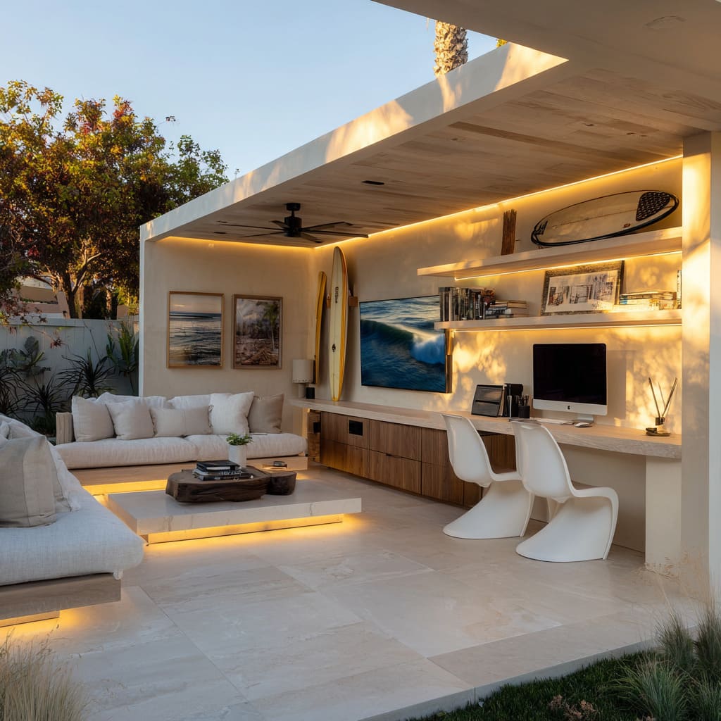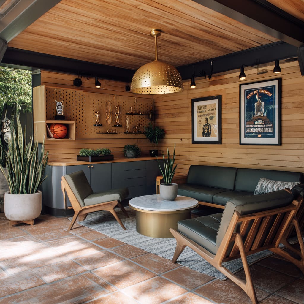 Many backyard man cave ideas hide practical uses behind design gestures. A media wall might extend into a slim desk for occasional laptop work; two sculptural chairs at that desk make the dual function feel intentional.