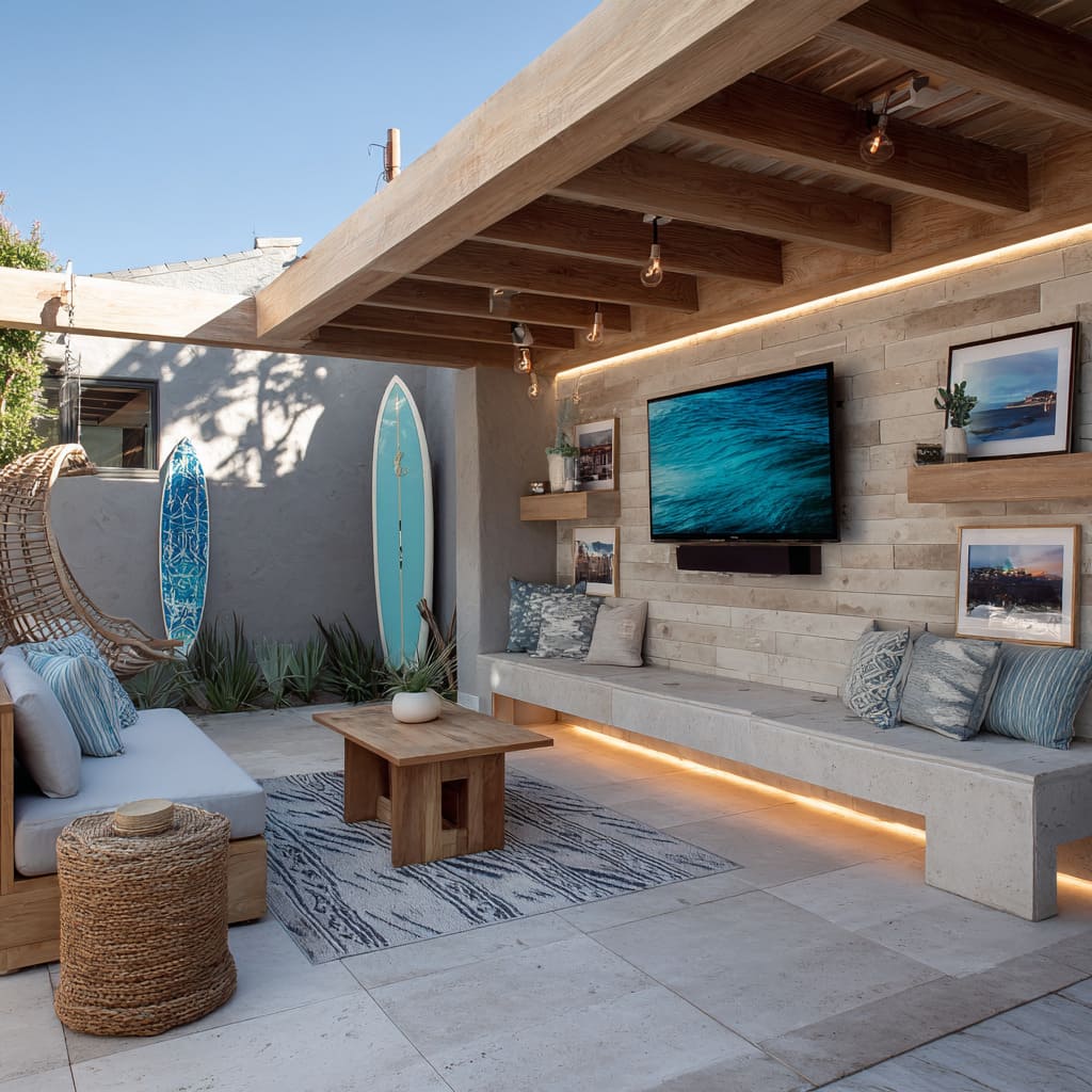 Whether it’s a desert courtyard with curved plaster benches glowing like embers, a timber pavilion with guitars and posters balanced in rhythm, or a beach-inspired space with floating concrete seating, each setting shows how composition can make leisure look architectural. These spaces aren’t about gadgets or luxury for its own sake—they’re about visual harmony that quietly tells a story of personality and taste.