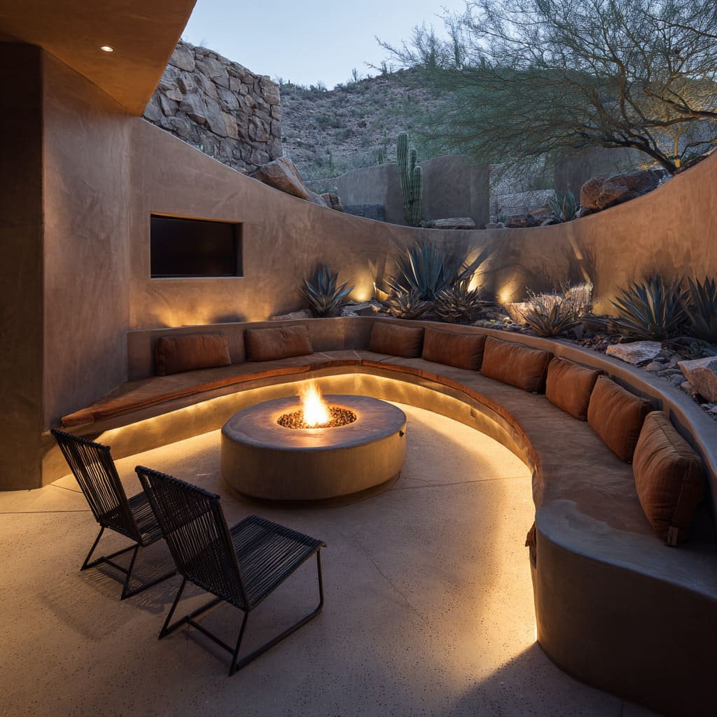 Fires or low hearths sit at the same level as cushions so faces glow evenly across the circle. Multi-level seating—such as a primary sectional with raised steps or a bench behind—adds depth without crowding.
