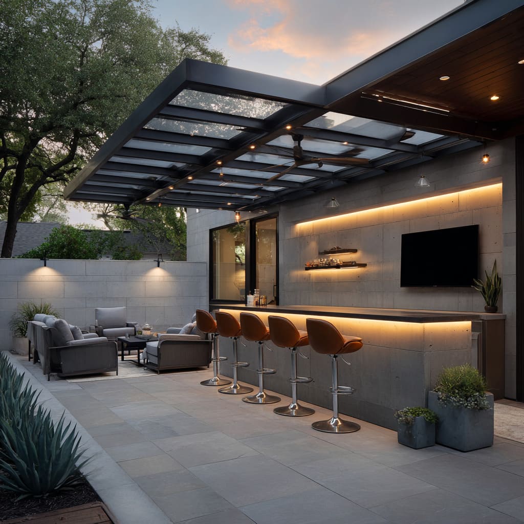 A subtle trick in many modern backyards is to let one material run through several functions: the same stone might wrap a bar face, a planter ledge, and a low hearth. This repetition builds visual rhythm.