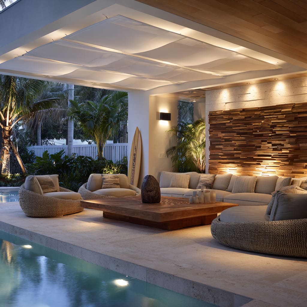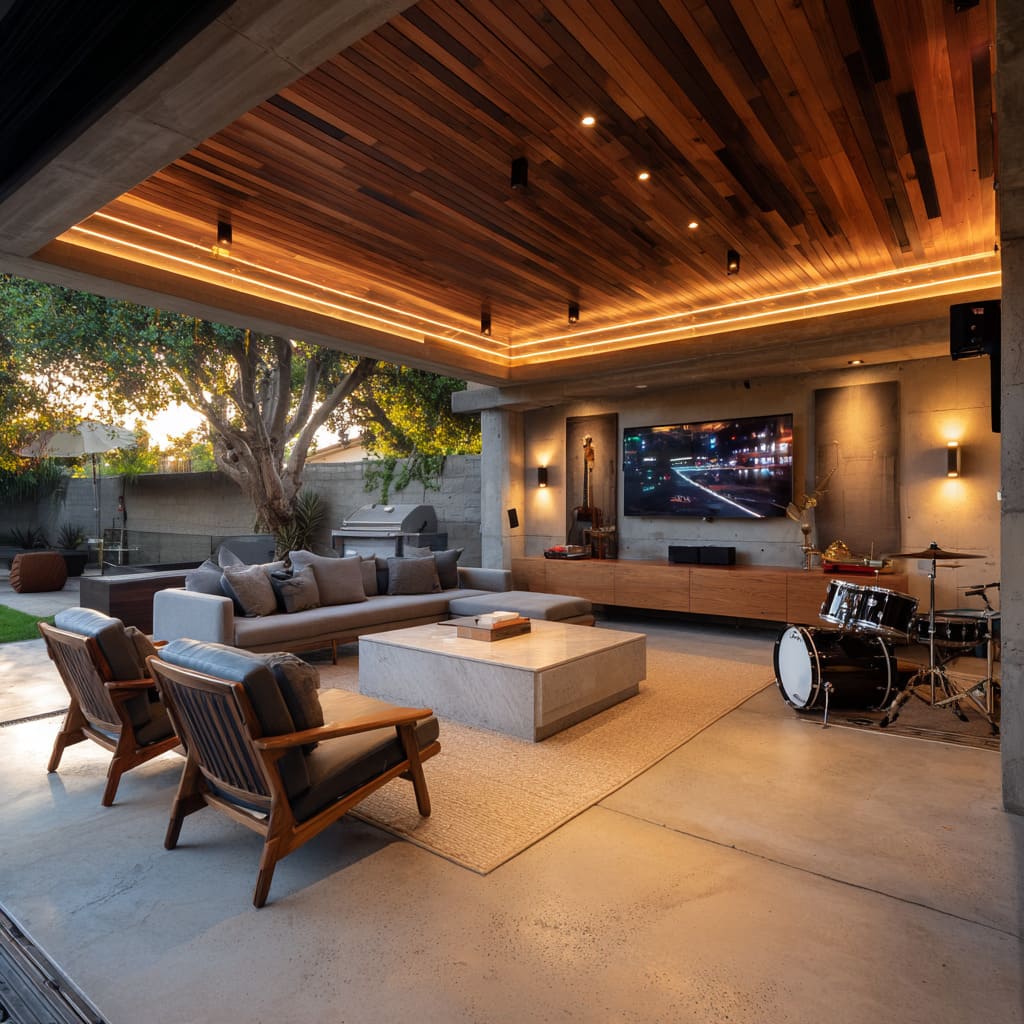 In many contemporary setups, the ceiling or pergola becomes the real design element. Some use matte charcoal panels with narrow LED slots that echo the joint patterns of the walls, while others let wood planks shift tones like piano keys.