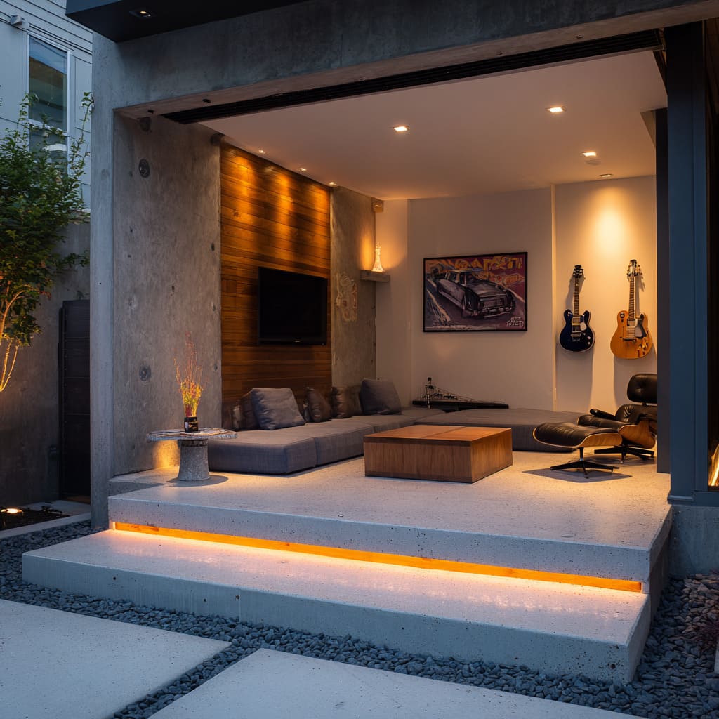 A successful outdoor man cave depends on how heavy and light elements are distributed. A floating concrete bench with a soft underside glow looks sleek and surprisingly weightless.