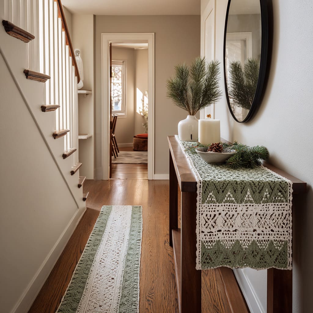 Green-and-cream crochet appears on both a console and a matching floor runner, forming a continuous visual “railroad” leading through a stair hall.
