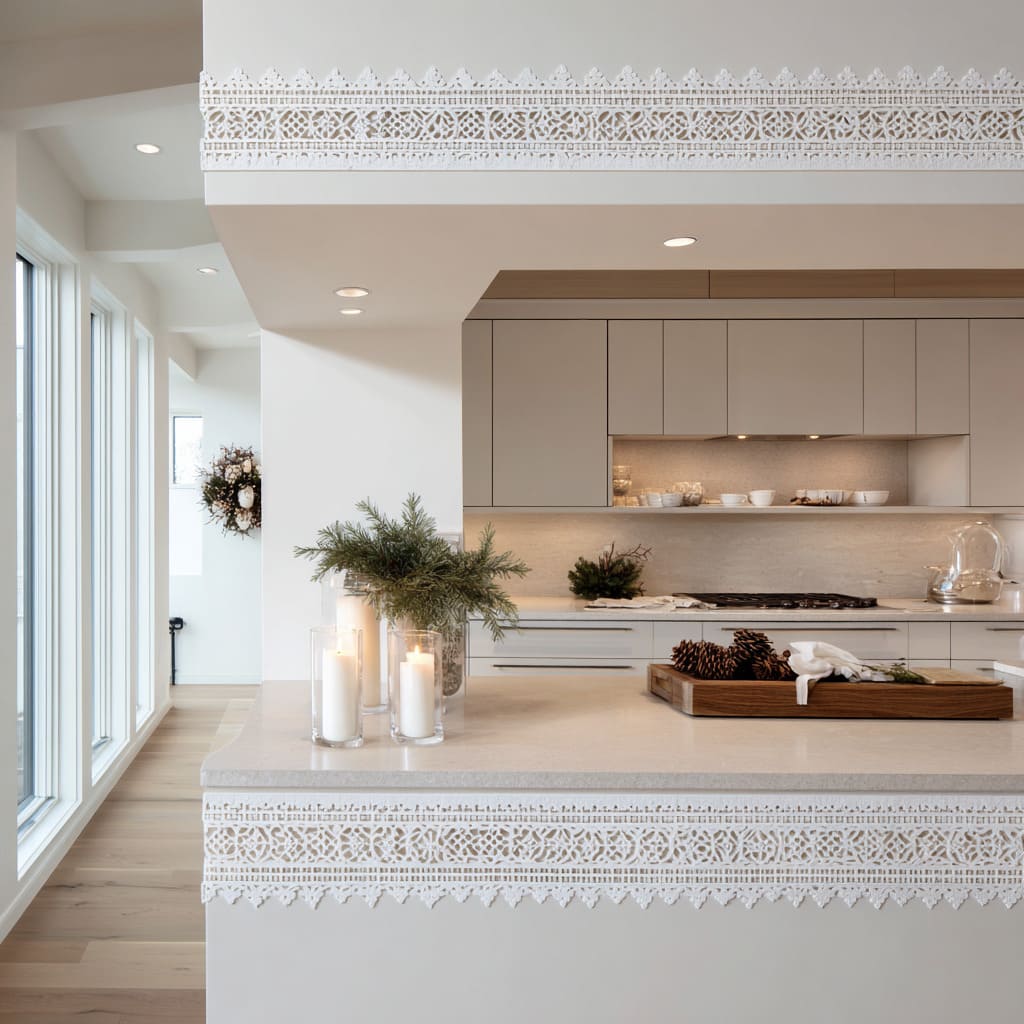 A narrow white band running around a kitchen bulkhead behaves like a soft cornice; lace under a peninsula counter falls like a delicate frieze; a scalloped panel rising behind a console reads like a temporary winter wainscoting. The decorating logic is subtle: the building stays structurally the same, but its visible “edges” wear a seasonal garment.
