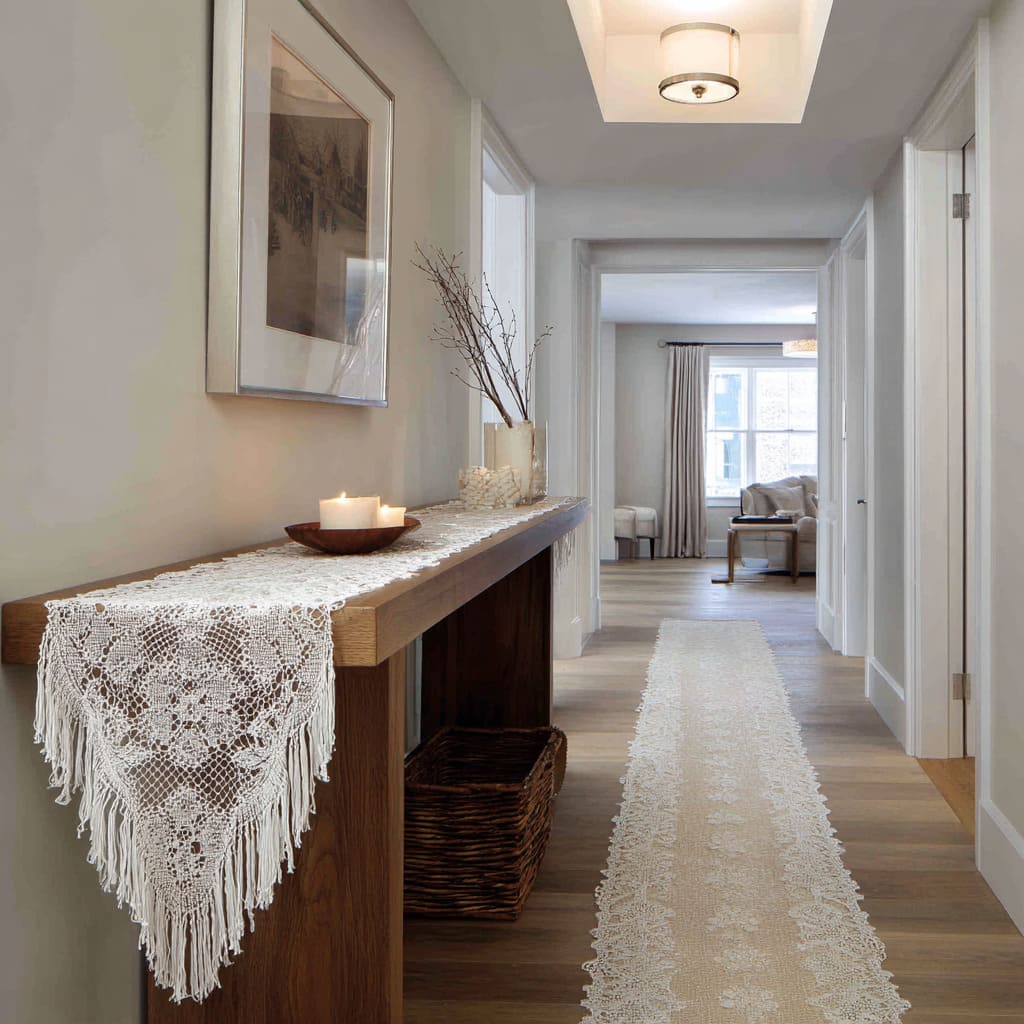 Even without using figurative signs, it can guide movement through lace and runners. Narrow floor textiles in hallways form a soft path that leads from entry to kitchen, from stair to sitting room, or from front door to living area.