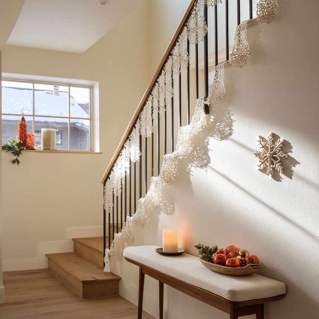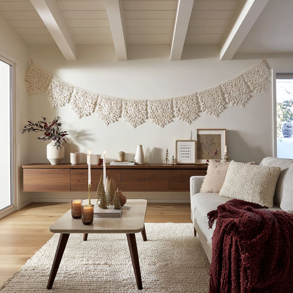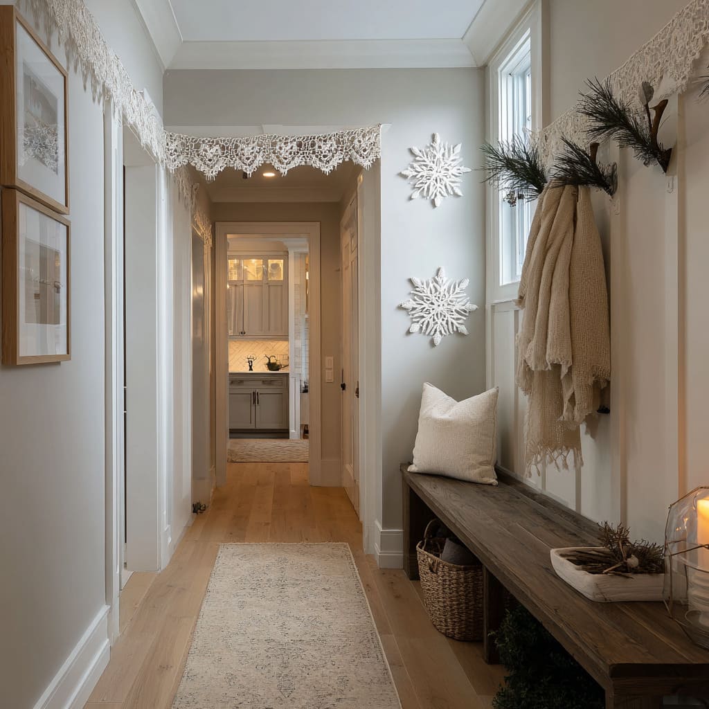 Living rooms can keep red confined to a single cushion or throw that repeats the tone of berries on a shelf or foliage in a vase. Some hallways and entries remain almost entirely neutral, with winter feeling suggested through lace, bare branches, candles, and snowflake shapes, so that they read as seasonal spaces suitable for the whole cold period, not just for a single holiday date.