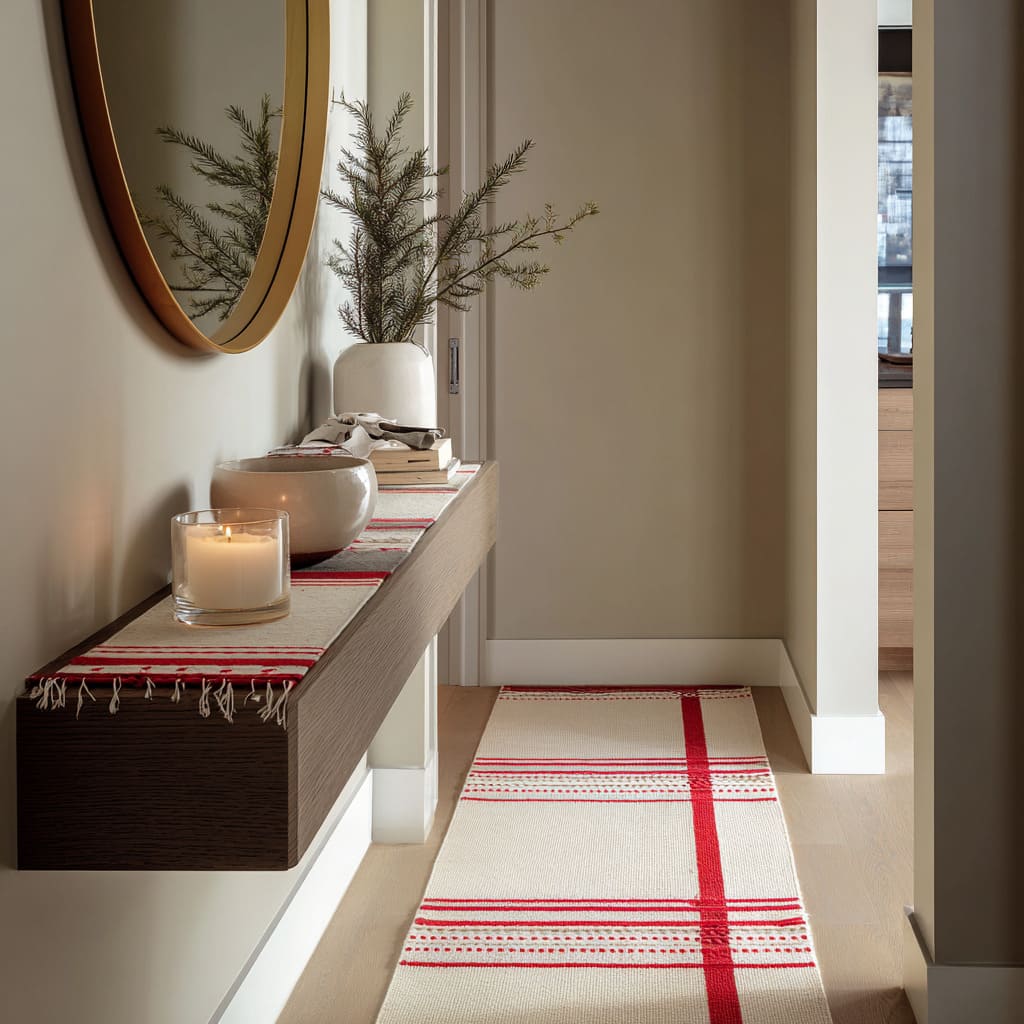 Transitional spaces such as entries and corridors gain a surprisingly rich seasonal character with very little visual noise. A narrow hallway may use one red striped runner on a slim floating console and a second, coordinated runner on the floor, accompanied only by a candle, a bowl, a few books, and a vase with light evergreen branches.