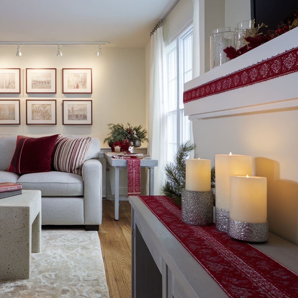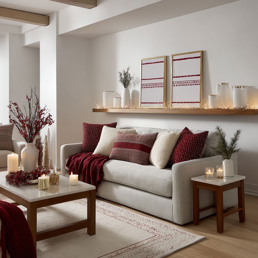 - Limited accent clusters – one group of berries, one red cushion, one patterned band provide all the intensity a room needs.