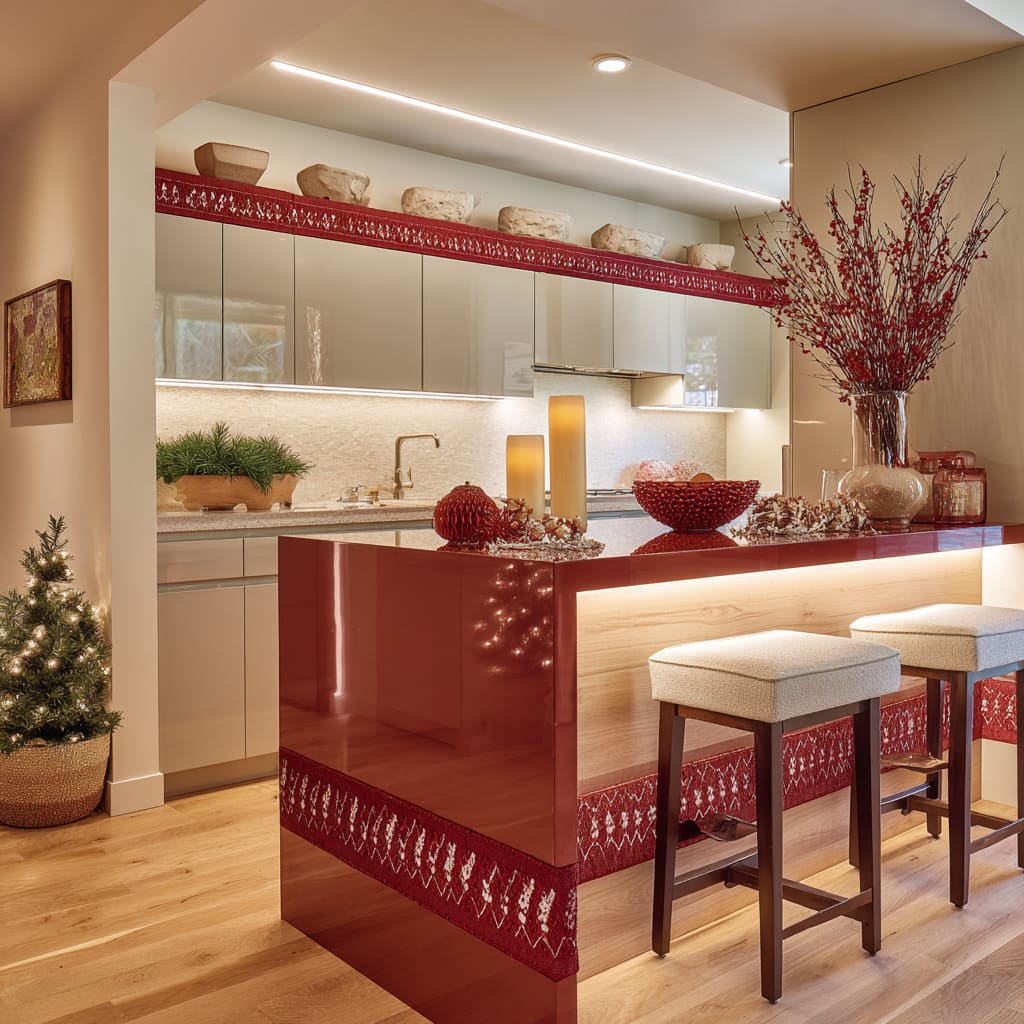 Even a highly saturated red island with glossy panels stays coherent because the patterned bands at its top and base, plus matching strip above the back cabinets, hold the color within a firm graphic system. Work surfaces can remain mostly open; the island, peninsula, or hood line becomes the main canvas for simple Christmas decorations that favor pattern, rhythm, and warmth over abundant objects.