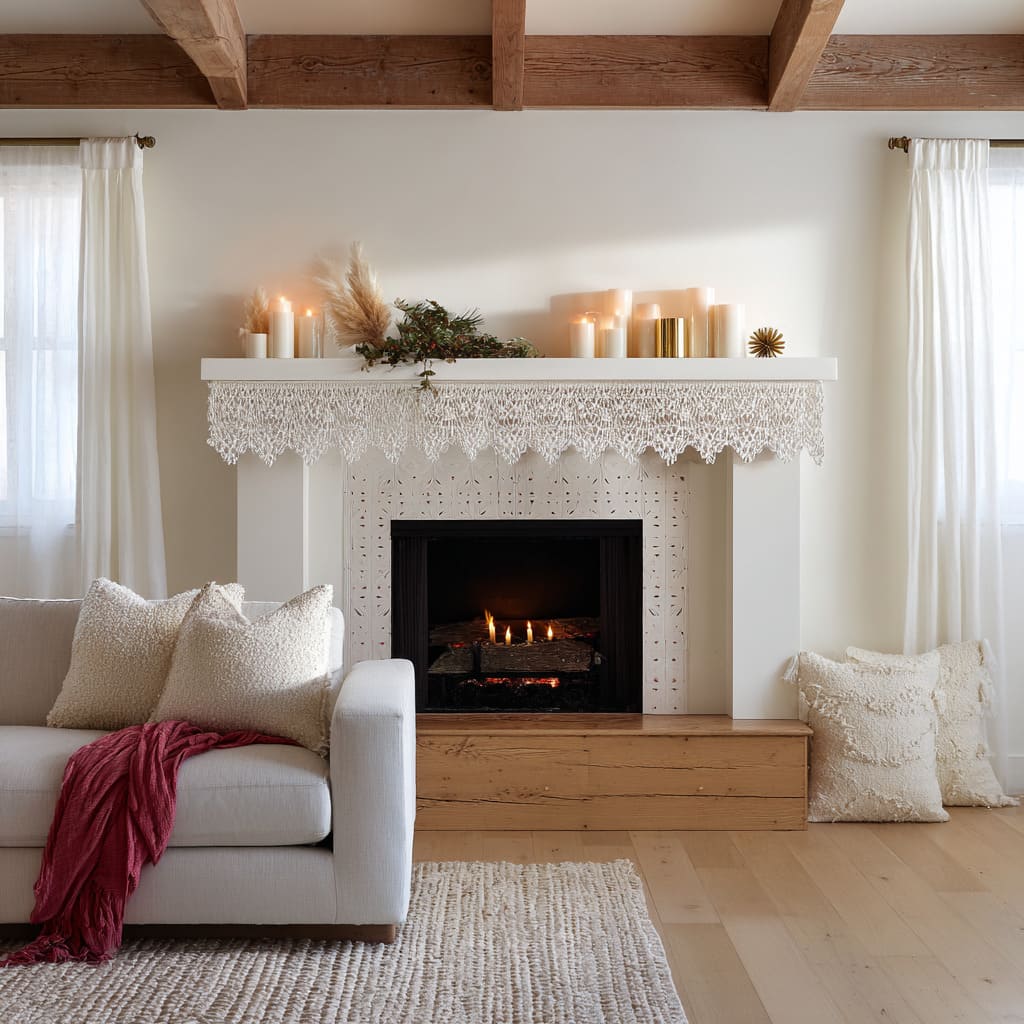 Mantels can gain a lace valance that hangs in delicate points over tile and flame; above, pampas plumes, greenery, and pillar candles form a second soft band, so the fireplace appears layered like a dressed figure: fire, tile, lace fringe, foliage, light. Evenwith red-and-cream stripe artworks and shelf lighting, the theme can stay organized: art translates textile patterns into graphic panels, while the actual lace sits as a slim underline or border.