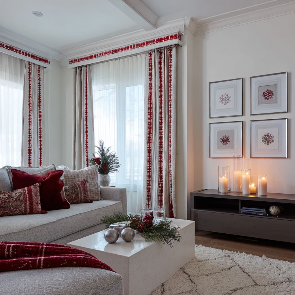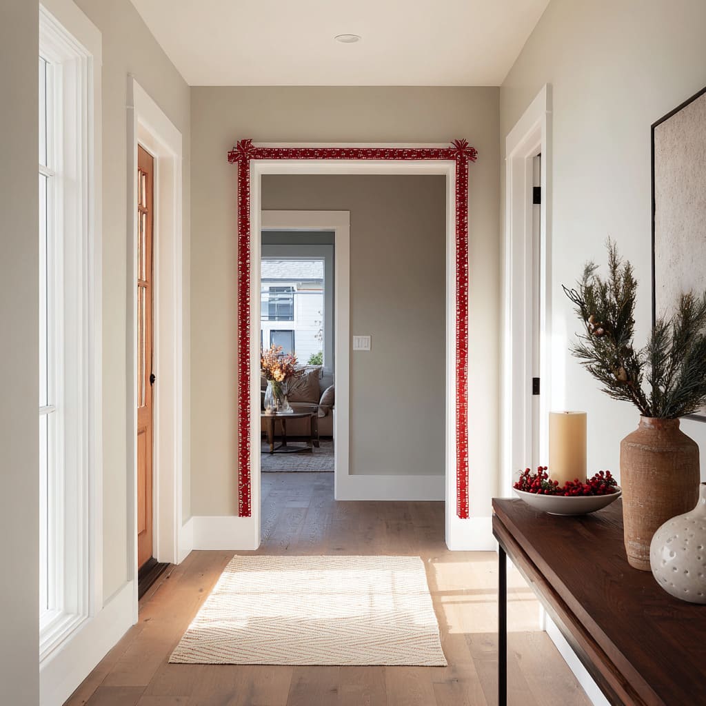 An open passage trimmed on all three sides with slim red bands works like a visual doorway into a warmer zone beyond, where neutral sofas, round tables, and dried branches continue the palette. These treatments allow architecture to carry the festive mood in a way that remains compatible with daily use—doors still open and close freely, curtains still move, circulation stays easy.