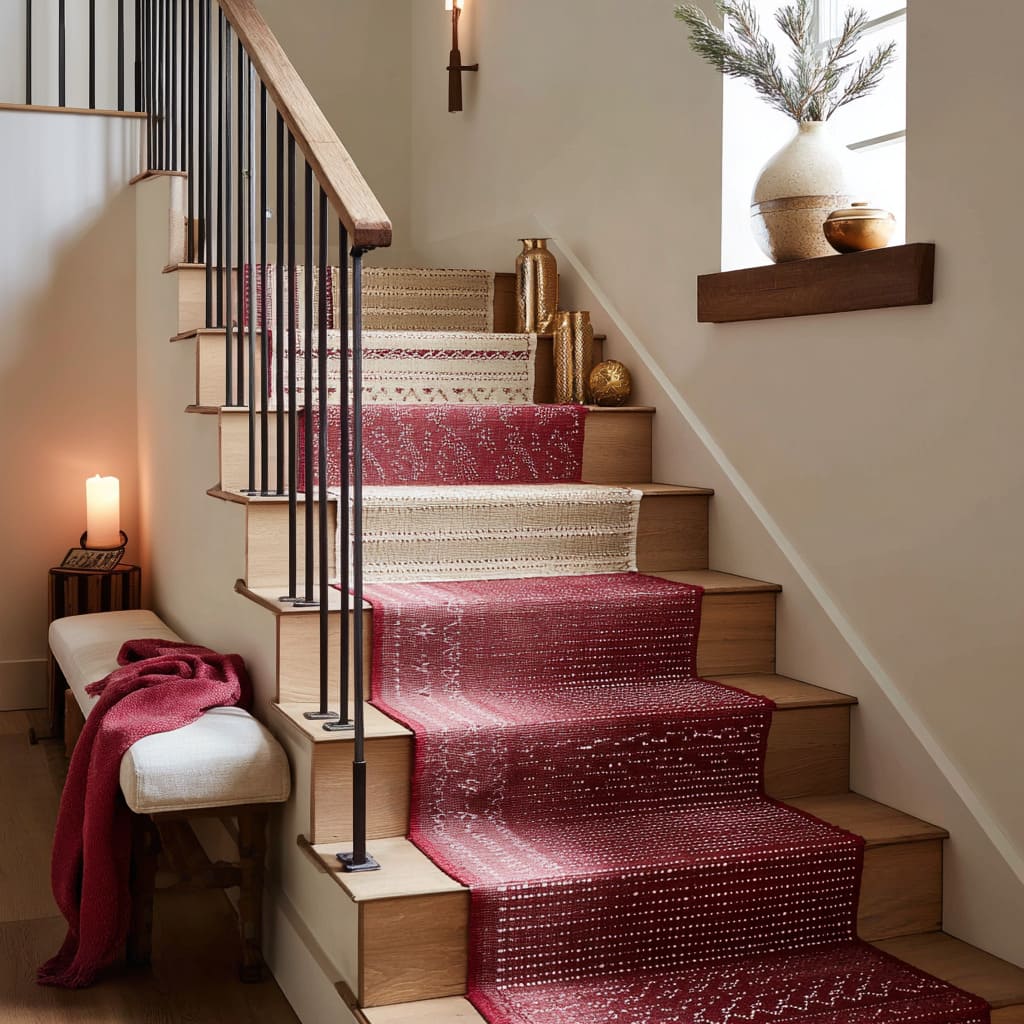 Their colors and patterns are not random; a red stripe or green band elongates the room and indicates direction, while lacy edges soften the line of travel. On staircases, alternating knit-look runners in red and cream create a sense of progression: deep red at the lower steps, lighter cream as the eye climbs, then red again near the landing.