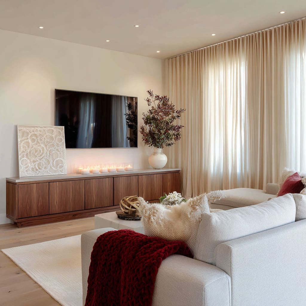 Living spaces in this style avoid heavy themed objects and instead rely on long horizontal lines and small motifs. A single floating shelf above a sectional sofa carries a narrow lace band along its front edge; on top sit neutral vases, a few tiny metal trees, a branch with red berries, and a quiet art piece in winter tones.