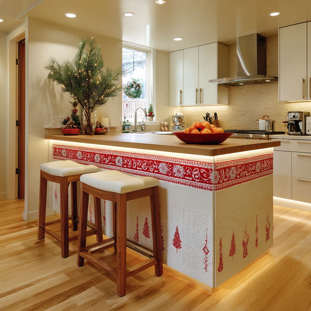 Kitchens in this approach often keep cabinetry and major finishes understated—a field of pale fronts, quiet stone, warm wood floors—and let lace or knit-inspired motifs carry the festive weight. One scene concentrates all decoration around a central island, where a red folk-style pattern wraps the upper part like a belt and then dissolves into small tree silhouettes and speckles near the floor.
