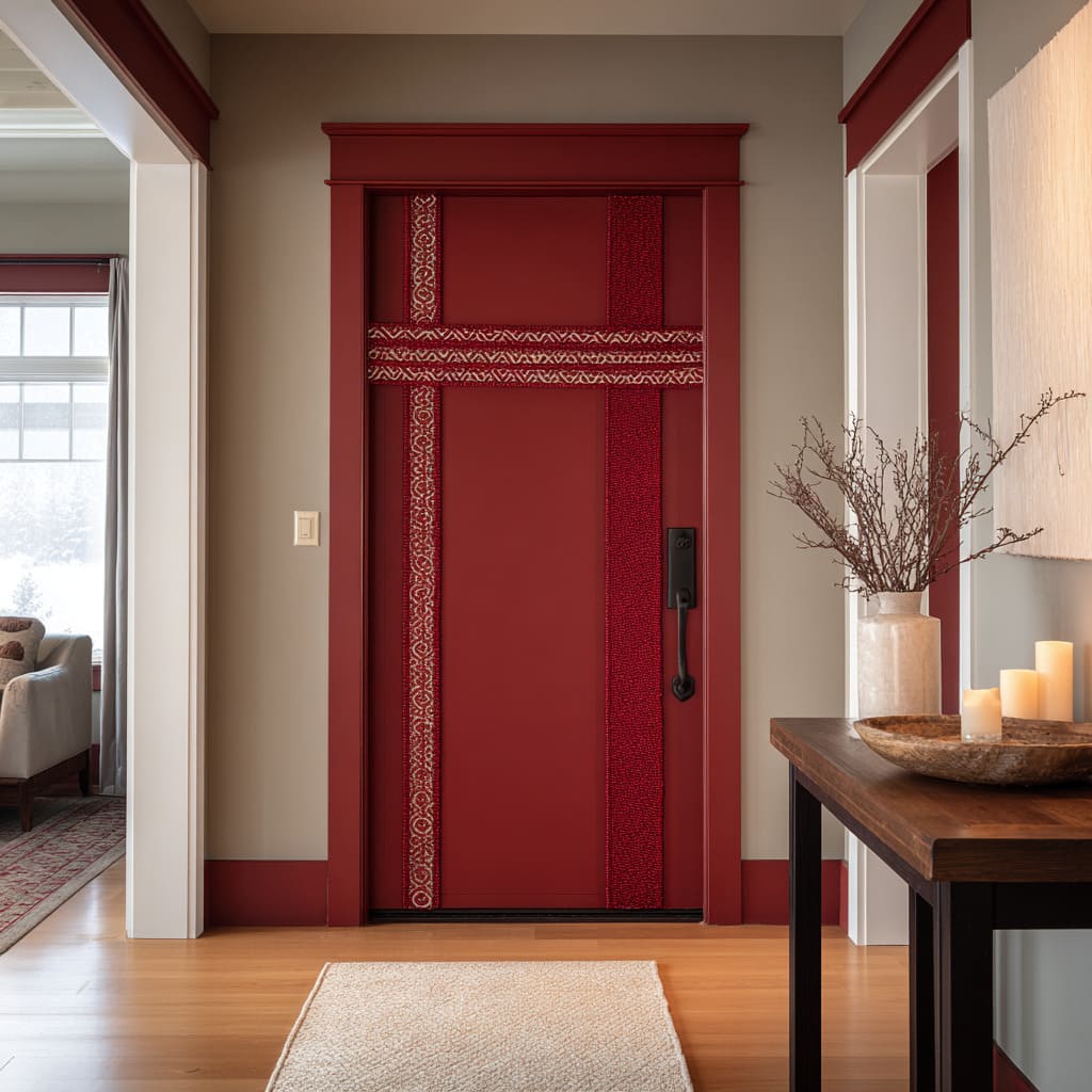 Even vertical red bands on an interior door are placed around the latch and handle, so the seasonal detail becomes part of the everyday motion of entering and leaving. The decor feels integrated into daily gestures rather than attached only to distant display zones.
