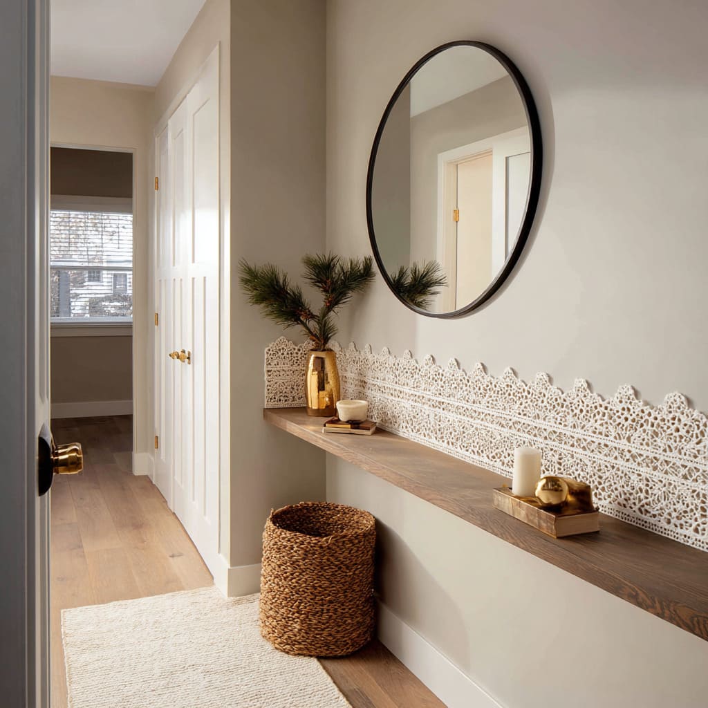 Another idea, a plank console and matching long lace runner on the floor form a calm duo of wood and crochet, guiding the eye toward a sunlit room beyond. Entries with strong red doors wrapped in patterned bands suggest a sense of ceremony each time someone arrives, while neutral rugs and consoles nearby repeat the warm wood and cream tones in a softer key.