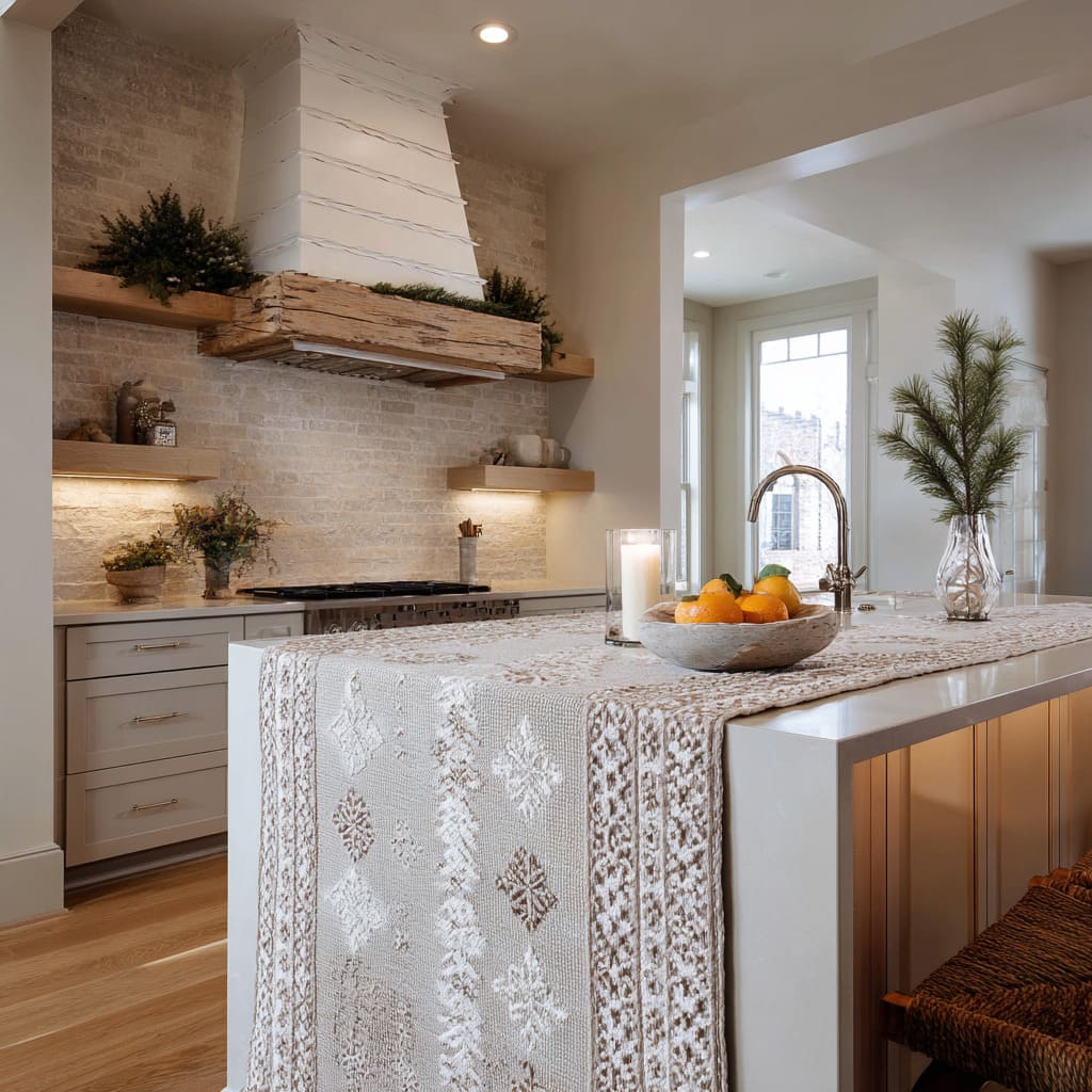 Another kitchen edges a bulkhead and peninsula in white lace that matches the wall color so closely that the effect relies on light and shadow; candles and evergreen sprigs on the counter continue the idea of winter delicacy rather than high drama. In more rustic spaces, a thick knit-look runner can pour over the side of an island, turning its hard block into something almost garment-like, while fruits, candles, and a lone pine branch sit calmly on top.