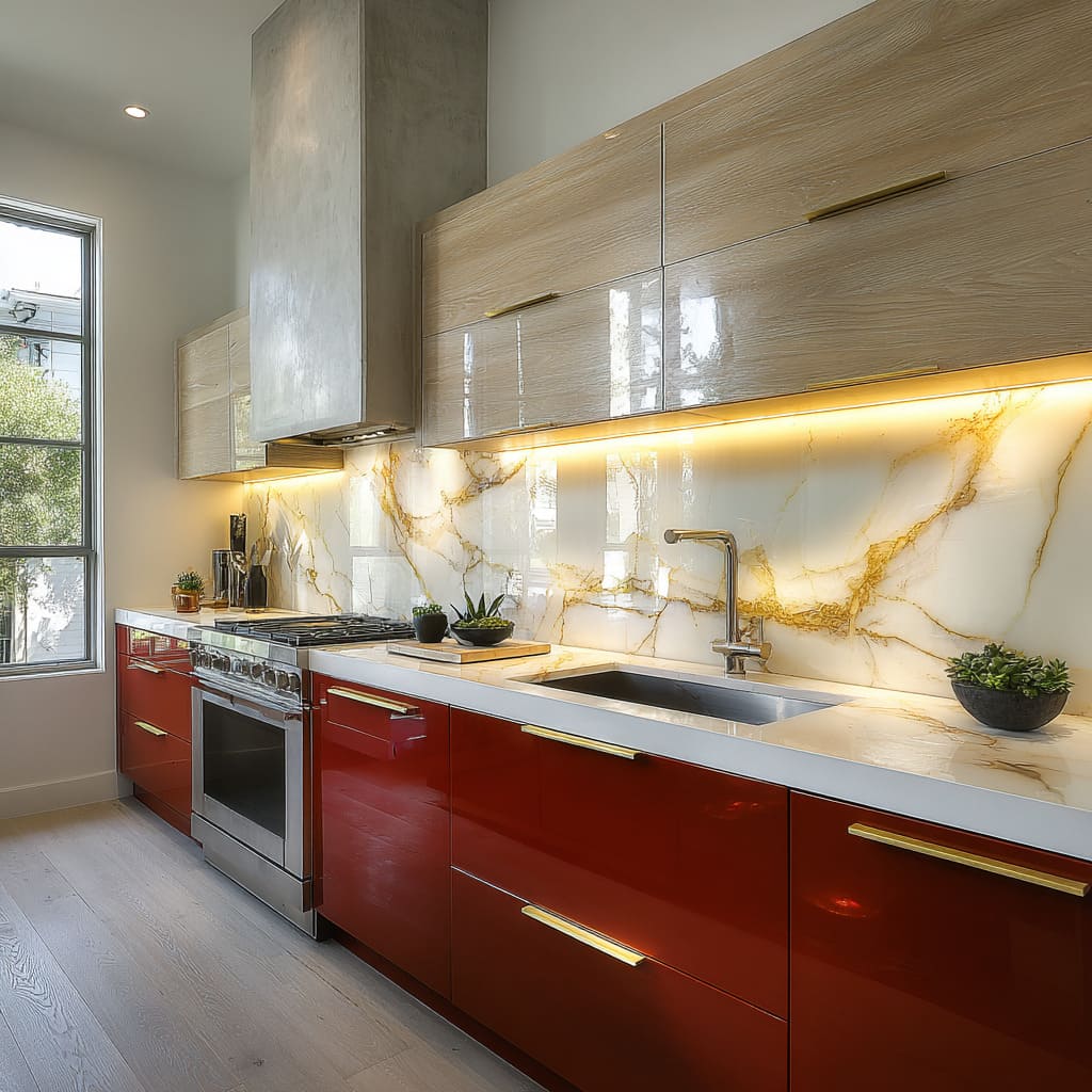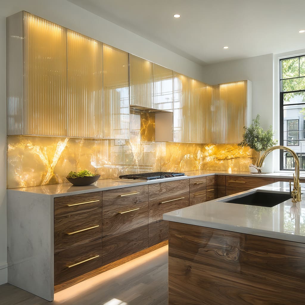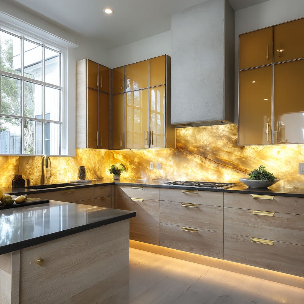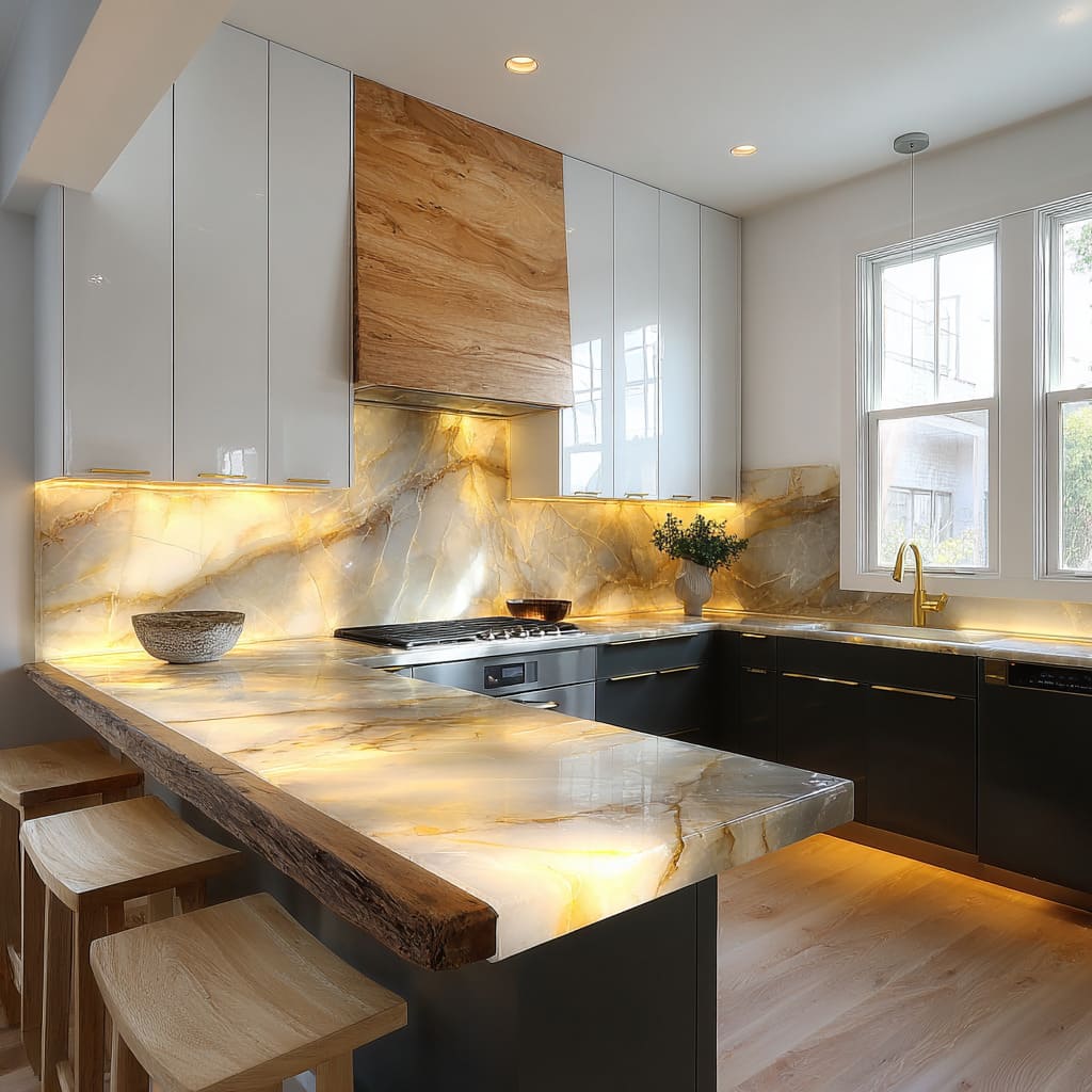 Under-cabinet lighting on a warm-veined stone backsplash creates a luminous strip at eye level. That strip is doing more than “lighting the counter.” It’s visually separating the lower depth from the upper lightness, so the split reads intentional and soft, not abrupt. - C. The island as a second bright plane