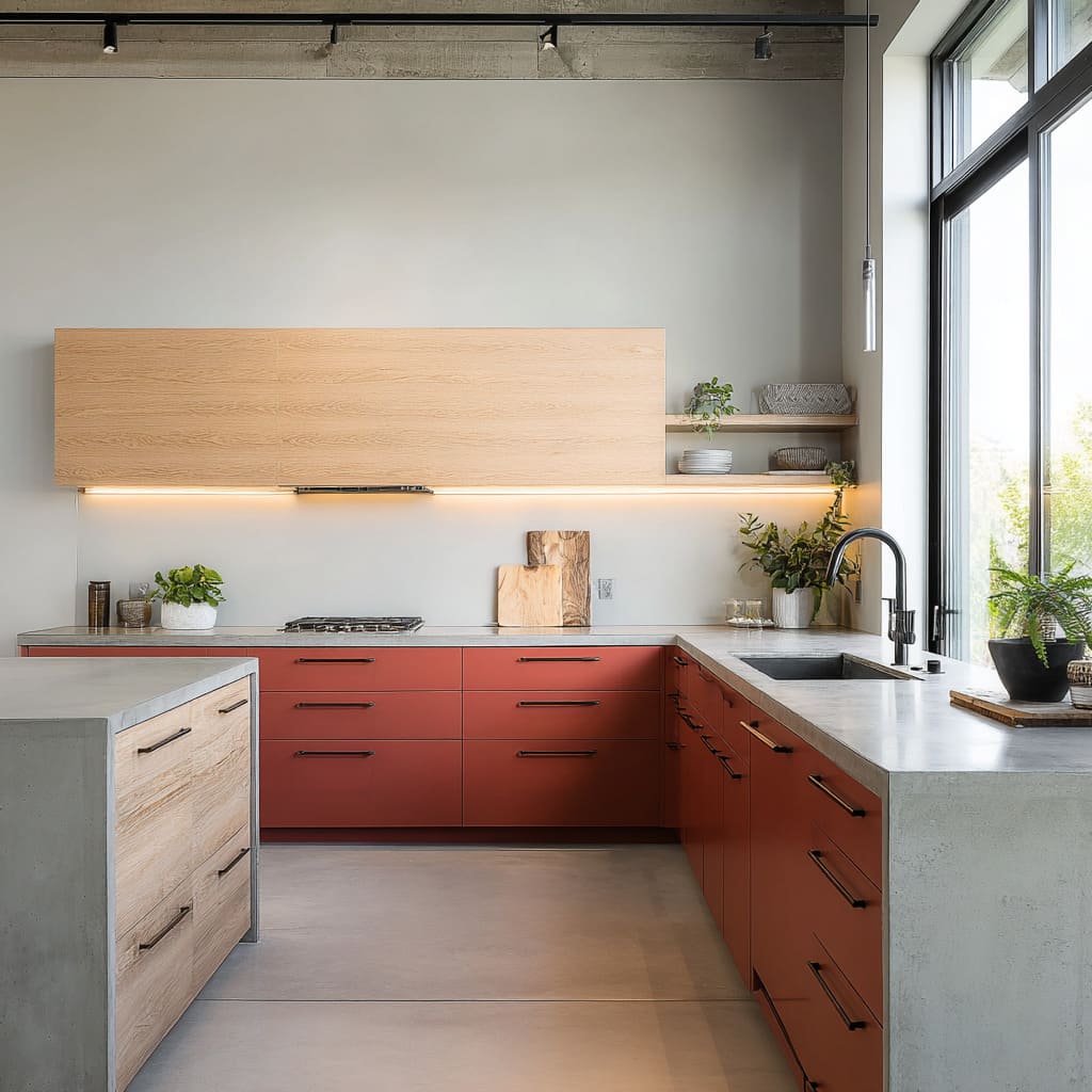 - A continuous counter/backsplash surface that reads as one pale band, letting the cabinet split be the main graphic.