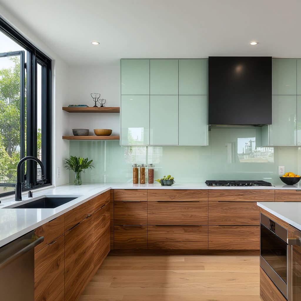 A glossy pale upper (or even a very smooth satin) can behave like a light amplifier. It catches window reflections and lifts the whole room’s perceived brightness without adding new “color blocks.” This is why a pale grey glossy upper can look brighter than a matte white in the same light. - B. The middle band that glows