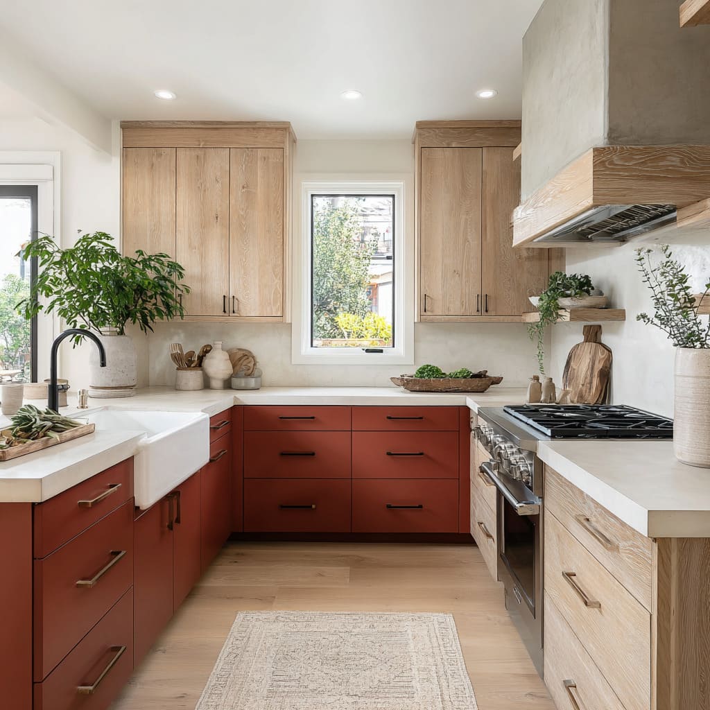 Most successful 2 color kitchen cabinet ideas treat the split like gravity: the lower tone carries “mass,” the upper tone carries “air. ” That’s why light uppers plus deeper lowers keep a kitchen feeling open even when storage is generous.