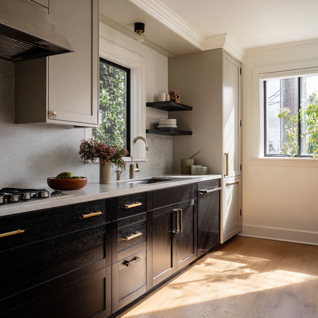 - Brass used in multiple locations (pulls + faucet + pendants) so the design has one consistent warmth reference that doesn’t depend on daylight.