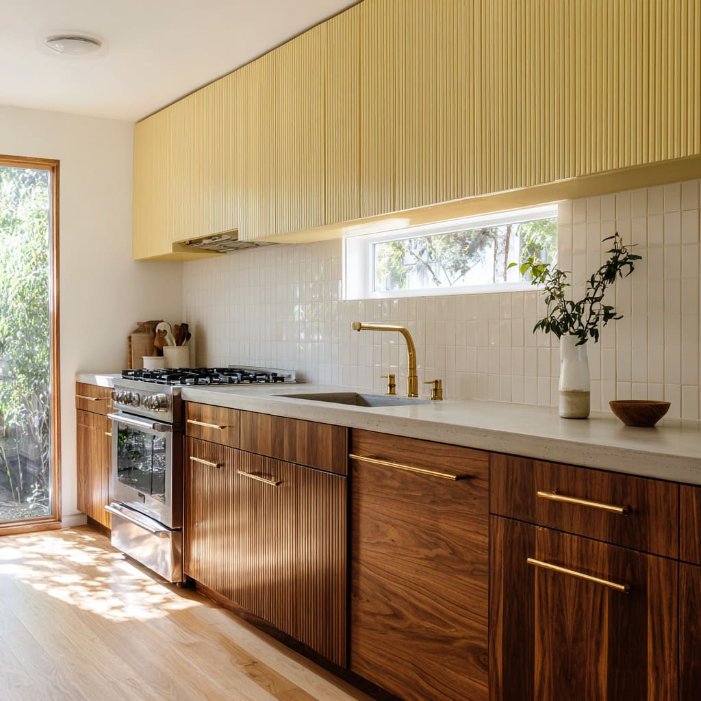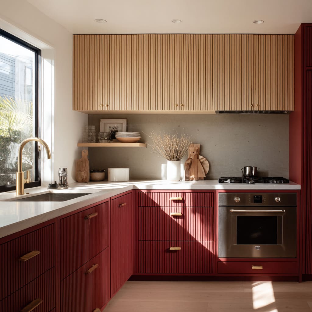 Fluted fronts break one large colored surface into many narrow highlights and shadows, lowering the “loudness” of a strong color without changing the color itself. It’s one of the most effective ways to make bold lowers feel mature and architectural.