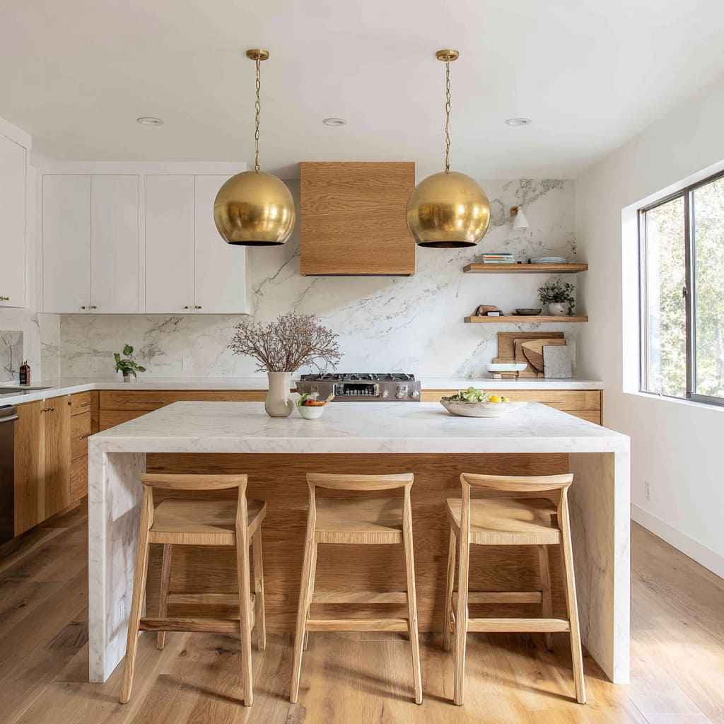 A waterfall island in pale stone repeats the upper “light field” at counter height. This is a big reason the white-and-wood kitchens feel airy: the eye keeps encountering calm, bright mass in the middle of the room’s design, so the wood doesn’t visually take over.